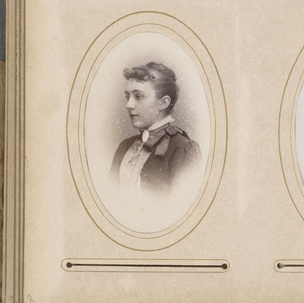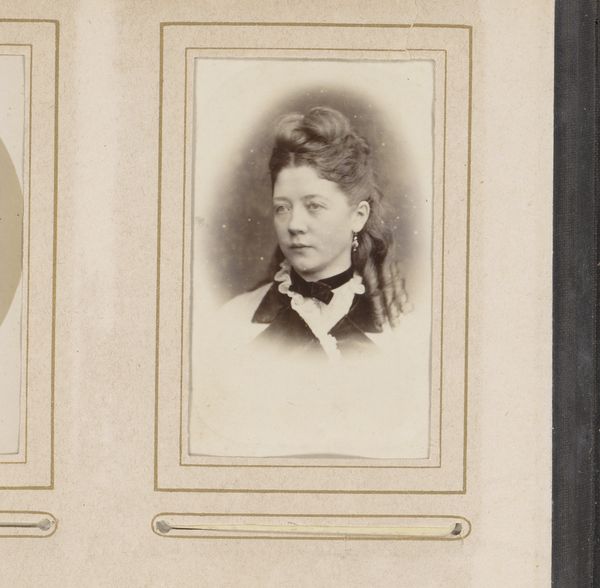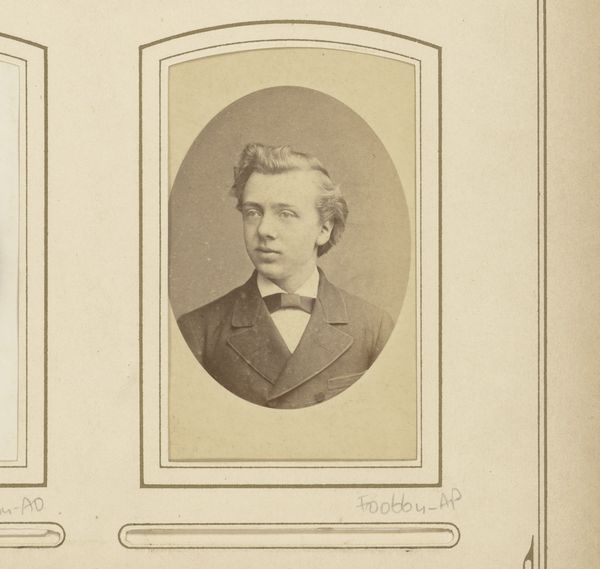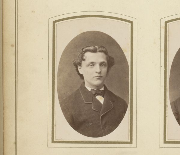 Curator: Here we have a portrait photograph, simply titled "Portret van een jonge man met vlinderstrik," which translates to "Portrait of a Young Man with a Bowtie." Its creation is placed between 1872 and 1879, with the photographer being Hendrik Anthonie Karel Ringler. Editor: What strikes me first is the sepia tone; it casts a melancholic, almost fragile aura. It reminds us of how much has happened historically between when it was taken and where we are now. Curator: Absolutely. This was the burgeoning age of accessible portraiture through photography. Think about the social implications. Suddenly, having your likeness recorded wasn't solely for the aristocracy. The working and middle classes now had this opportunity. Editor: Which brings us to the 'how' of its making. I'm interested in the photographic process and the sitter’s participation. The lighting must have required intense focus and patience to create this soft depth. His hair contrasts sharply with his expression; this photograph creates layers, right there. Curator: Indeed. We often romanticize the painter, but here the photographer has a vital role to play, navigating the technology to produce not just a visual record but also a work that conveys mood and class. Look at his clothes, clearly signifying his place within a social hierarchy of the late 19th century. He wanted to make the proper impression, of course. Editor: Considering that photographs like this were becoming relatively common at that time, did studios produce individual portraits or was mass production more common? And what influence did photographic technologies have on the painting tradition? Curator: That’s an excellent point! Photography both democratized and influenced painting, with its direct, representational method changing our perspective of traditional portraiture practices forever. Artists suddenly could no longer position themselves as unique producers of human likeness. Editor: A poignant and perhaps underappreciated example of this period. Thank you. Curator: My pleasure, it gives us a rich insight into the past while also helping us rethink art and visual technologies and their intertwined socio-political layers.