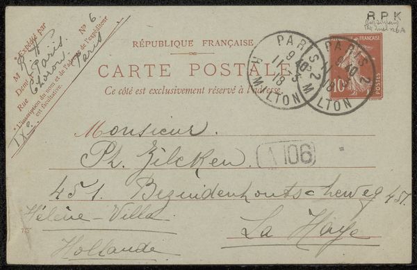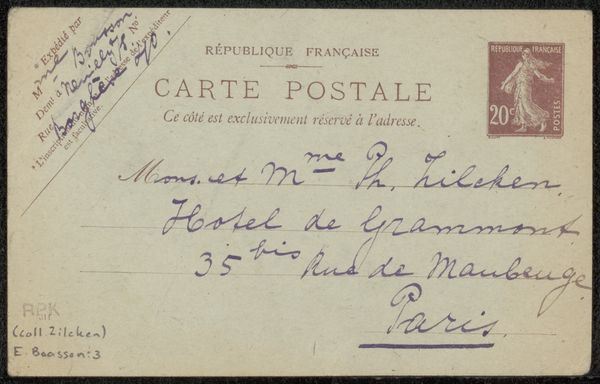 Editor: Here we have Albert Baertsoen's "Briefkaart aan Philip Zilcken," made before 1898, using ink on paper. It’s quite fascinating to see a postcard elevated to the level of art. What strikes me is the immediacy of it – a snapshot of a communication from another era. How do you interpret this work? Curator: It’s crucial to understand this postcard not just as a piece of personal correspondence, but as a crafted object reflecting its means of production and circulation within the postal system. Consider the paper itself: its specific weight, the texture affecting the ink's absorption. The printing of "Carte Pneumatique" indicates a particular, rapid mode of communication within Paris, connecting it to a network of technology and labor. Editor: So you're suggesting that the card's materiality and the system that delivered it are as important as the message itself? Curator: Absolutely. The standardization implied by the printed text contrasts sharply with the hand-written address. It’s where labor is seen. Think of the postal workers, the industrial production of paper and ink – all embedded in this seemingly simple object. Where does "art" begin and the everyday labor end here? Editor: I hadn't considered all the layers of production involved. It reframes my view, shifting it from simply the artist and recipient to all the other workers. Curator: Precisely. By examining these material conditions and the broader social context, we can move beyond a purely aesthetic appreciation and understand how art is fundamentally intertwined with production, consumption, and even the social networks of the time. Editor: That's really broadened my perspective. I see the postcard now as less about its surface content and more about the system of labor and technology it represents. Curator: Exactly. It's about uncovering the processes that make art possible and interrogating what we value and why.