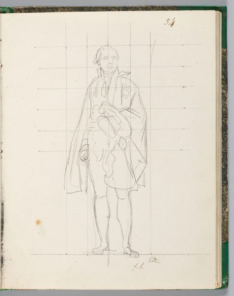 Curator: This is Jacques-Louis David's "Monsieur de Brigonne," a pencil sketch measuring about 21 by 16 cm, housed here at the Harvard Art Museums. Editor: It feels so fragile and immediate, like a fleeting thought captured on paper. The grid underneath gives it such an interesting dynamic. Curator: Indeed, the grid suggests a preparatory study, perhaps for a larger, more formal portrait. Notice the delicate rendering of the clothing, the almost hesitant lines defining his stance. Editor: He looks like he's about to step off the page and tell you his troubles. There's a vulnerability that's quite touching, especially given the subject's presumed social standing. Curator: Precisely. David's skill lies in capturing both the outward appearance and the inner character. This small sketch gives us a glimpse into his artistic process. Editor: It's funny how a simple grid can sometimes reveal more than the artist intended. So much intimacy, as if we're eavesdropping on a private moment. Curator: Exactly. It's a privilege to witness such artistic intimacy. Editor: Absolutely, a rare glimpse behind the curtain.