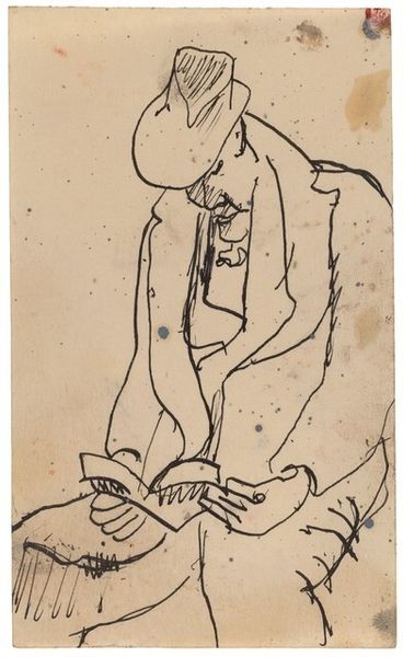 Editor: So, this pen and ink sketch is titled "Seated Man in Overcoat and Hat, Right Hand Pointing" by Mark Rothko. It’s deceptively simple, almost like a doodle, but there’s a somber feel to it, almost haunting. What are your initial thoughts on the work, thinking about his artistic process and the materials themselves? Curator: The immediacy of the pen on paper speaks volumes. Notice the quality of the paper itself, the texture, the slight staining, suggesting it might have been scrap material. Rothko’s known for grand color fields, right? But here, we see him experimenting with line, perhaps working through ideas on readily available, inexpensive materials. Editor: So, the material almost demystifies the artist…makes it seem more…accessible? Curator: Precisely! It collapses the hierarchy between 'high art' and the quotidian. Consider the act of drawing itself, a fundamental, almost primal form of mark-making. The rapid, almost frantic lines suggest a restless energy. What social context could contribute to this manner of execution? Editor: Maybe the economic constraints during that period influenced his choice of cheaper materials or rapid execution style? A scarcity influencing his production. Curator: Exactly. Thinking about the labor involved—the speed of the drawing, the possible social factors, changes our perception. This isn’t some carefully rendered masterpiece; it’s a working sketch. Editor: It’s like we’re witnessing the very moment of creation, without any pretension. This idea changes my entire perspective about art history…it feels a bit democratizing to consider that materiality so directly! Curator: Absolutely! By engaging with the material reality and the process, we gain access to a deeper understanding of Rothko's artistic intentions. Considering this opens space for others previously excluded.