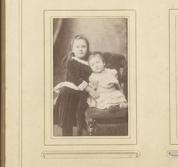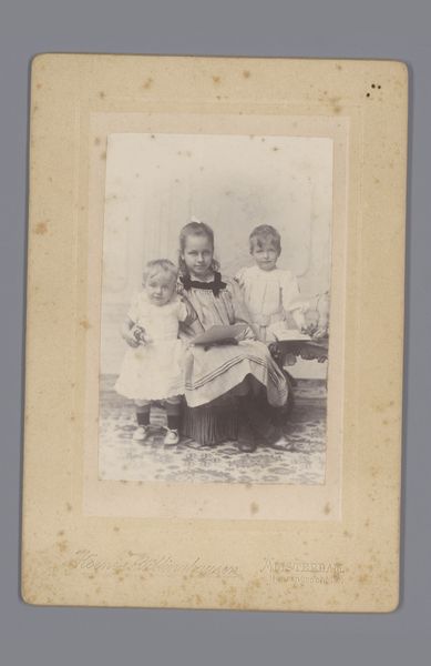 Editor: Here we have "Portrait of three children with a dog," a gelatin-silver print from sometime between 1870 and 1890, attributed to Foto Busnach. It's a sweet image, although there's a formality to it. What stands out to you? Curator: I see the children positioned almost as symbolic figures against a rather stark background. Consider the dog. It’s more than a pet; it embodies fidelity, loyalty, even guardianship. The children themselves – their poses, their clothing - these were consciously constructed representations of childhood innocence and societal values. What memories, do you think, were being preserved here? Editor: I suppose the parents wanted to capture a sense of propriety and family pride. It feels staged, almost like a tableau vivant. Curator: Precisely! And this staging tells us a great deal about the cultural expectations of the era. The very act of commissioning such a portrait was a declaration of status and aspiration. Does the composition remind you of any specific conventions of portraiture that were popular in that era? Think paintings, perhaps. Editor: I can see the echoes of formal, academic portraiture. It's interesting how photography so quickly adopted those conventions. The subdued palette, too, evokes a sense of gravitas. Curator: Absolutely. The photographer employed emerging photographic techniques, yet they adhered to established social visual codes. And look at the subtle tension: the dog is restless; is this a memento of life or performance? Editor: It makes me wonder what their lives were actually like beyond the photograph. This really does say more about societal expectations than about these kids as individuals. Thanks, I never would have looked so deeply into what seems like just a normal picture! Curator: Indeed! Photography like this is an exercise in reading social aspirations and symbolic messaging. It makes the past feel richer, more meaningful.