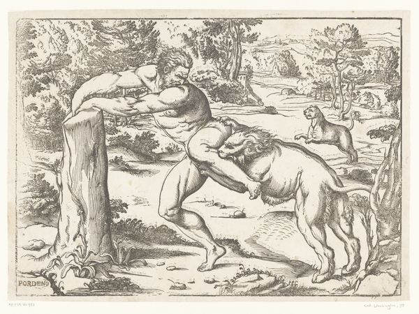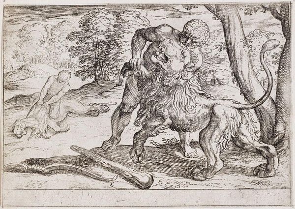 Curator: Here we have "Hazenjacht" a pen drawing likely from sometime between 1601 and 1650, attributed to Philips Serwouters. What strikes you about it initially? Editor: It’s restless, wouldn’t you say? All motion and energy. A slightly unsettling hunt scene teeming with figures seemingly caught in mid-action across the composition. Curator: Yes, the dynamic lines certainly contribute to that sense of frenetic movement. The artist employs a sophisticated use of hatching and cross-hatching to model the forms, giving volume to figures rendered economically. Note how this use of line directs the eye. Editor: What’s compelling here, and perhaps deeply rooted in the era it reflects, is its visualization of privilege and power structures. Look at the hunters on horseback versus those struggling on foot amid a pack of dogs. Class division rendered explicit. Curator: I see what you mean. Although, let’s not forget Serwouters keen attention to detail throughout this image—consider the foliage of the forest backdrop against the figures. It offers us a very coherent pictorial plane despite the implied depth of field, constructed almost entirely through these very carefully applied, and quite complex, patterns of line work. Editor: I’d say this is a celebration of the aristocratic hunting tradition but, through a modern lens, what exactly are we being asked to admire? It invites scrutiny about human domination over animals. Curator: Perhaps you are right that Serwouters work highlights a perspective of its period, reflecting an understanding of human dominion over nature through social and symbolic means. Its technique makes us continue questioning, and appreciate the value of its history. Editor: Definitely— it offers so much layered narrative. Viewing this gives a deeper sense of the social structures in place.