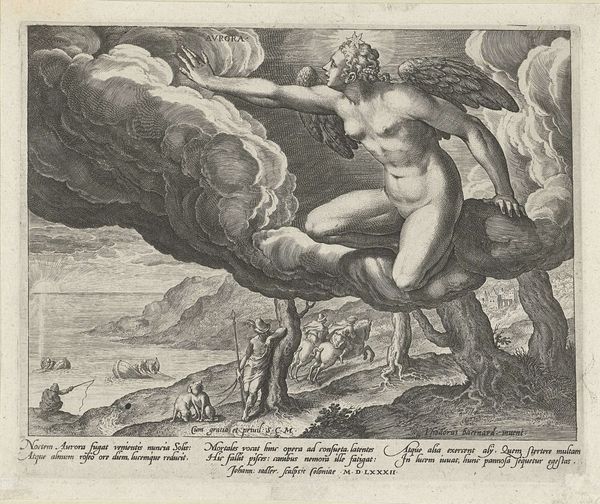 This print, titled “Nacht” or “Night”, was made anonymously using engraving. Here we see the cultural concept of night personified as a muscular male figure in a dark cave, surrounded by nocturnal symbols like owls and bats. This image probably originates from the Low Countries, present-day Belgium and the Netherlands, sometime in the 16th or 17th century. The Northern Renaissance witnessed a surge in allegorical prints like this one, reflecting a society steeped in classical learning and religious symbolism. The use of Latin reinforces this sense of classical authority, as does the idealised male nude, derived from classical sculpture. This print presents a vision of Night as a powerful, even threatening, force. To understand this image more fully, one might consult emblem books and astrological treatises from the period to appreciate what ‘Night’ meant to the people of the time. Art historians can reveal how the image of "Nacht" reflects the worldview of its time.