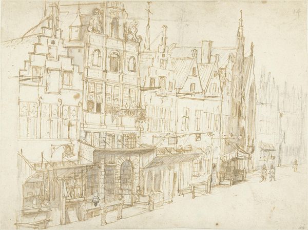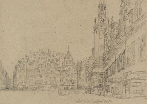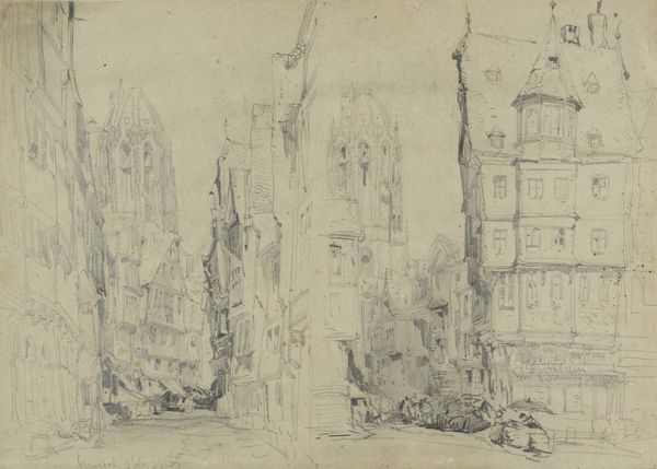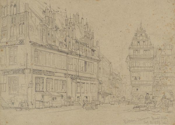 Curator: William Callow’s delicate pencil drawing, “Old Palais de Justice, Malines,” captures a bustling Belgian cityscape. Editor: It's evocative! The skeletal outlines of these buildings, like phantom structures, hint at a past grandeur struggling to remain visible. Curator: Indeed. The Old Palais was a site of significant political and social power. Its image speaks to colonial rule and the function of justice within the city. Editor: I see the repeated vertical lines of the architecture, drawing the eye upward—perhaps indicating an aspiration to higher laws, or…domination? The steeple hints at a connection between the secular and the divine. Curator: Absolutely. The arrangement of people in the foreground, their scale relative to the imposing architecture, signals power dynamics and the role of citizens. Editor: This reminds us of the layered meanings embedded in every urban space, making us question whose history gets told. Curator: A vital point. These glimpses invite us to consider Malines, colonialism, and justice through an intersectional lens. Editor: It really invites a deeper look at the visual language of power etched into our shared spaces.