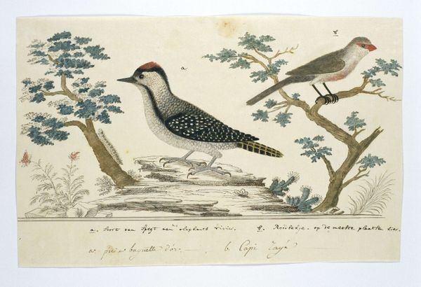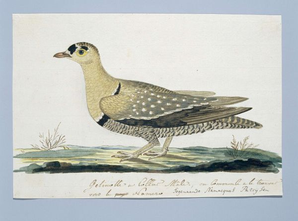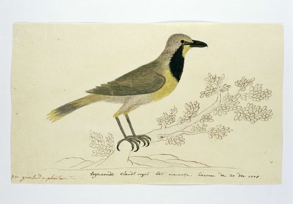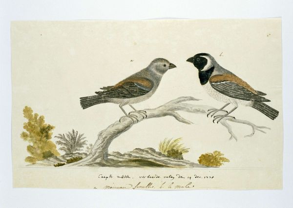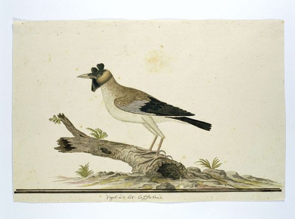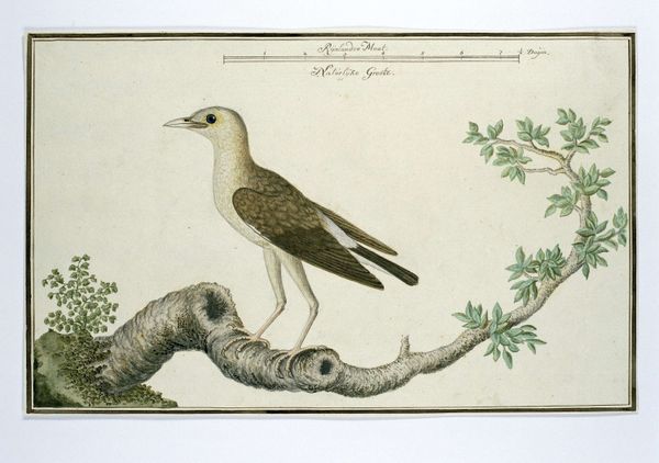 Editor: We're looking at a drawing titled "Oenanthe pileata," or Capped Wheatear, possibly from 1778, by Robert Jacob Gordon. It's watercolor and ink on paper. It feels like a very scientific illustration, almost like a page from a field guide. What's striking to you about this piece? Curator: What I find fascinating is understanding this piece as a product of its time. Think about the role of exploration and colonization in the late 18th century. Gordon was a military commander in the Dutch East India Company. These detailed drawings weren’t just about documenting the natural world. They were instruments of colonial knowledge, defining and classifying the resources and inhabitants of the Cape. Who has the authority to name and categorize the natural world, and what purpose does that serve? Editor: So, the seemingly objective illustration has a hidden agenda? Curator: Exactly. The "objectivity" itself is a constructed viewpoint. Consider the inscription beneath the bird – that adds another layer, connecting the image to language and ownership. And it highlights a social relationship. Who were the “sheep watchers” who knew this bird? Whose knowledge is being validated and whose is being erased in this process of documentation? Editor: That reframes my entire understanding of the image. It’s more than just a pretty bird; it’s a document with complex historical and political implications. Curator: Precisely. Thinking about art within its historical context allows us to understand how power and knowledge are intertwined and reflected in these seemingly straightforward images. It makes you wonder who gets to write the story of the land and its inhabitants. Editor: This really makes me think about the role of museums in perpetuating some of these power dynamics, too. I’ve got a lot to think about now!