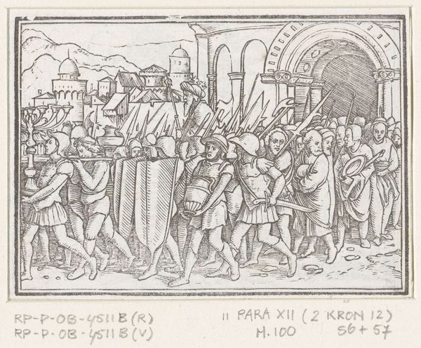 Editor: This woodcut, "2 Chron. XII" by Hans Holbein the Younger, depicts a procession of figures carrying spoils. It feels very narrative, like a scene from a play. What significance do you see in this imagery? Curator: The act of carrying, and what is being carried, is laden with symbolic weight. Note the figures bearing the menorah and shields: these objects are not merely loot, they are the visual representation of power, faith, and identity, embodying a cultural memory being actively reshaped. Editor: So, the image is about more than just plunder? Curator: Precisely. It’s about the transfer of cultural power and the construction of a new visual order. The act of procession reinforces this. What emotions does this evoke? Editor: It feels like a story about conquest and the rewriting of history through symbolic objects. I see that now.