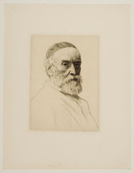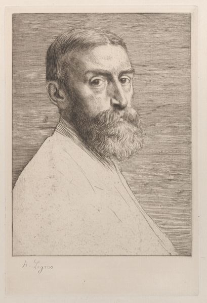 Curator: This is Alphonse Legros’s etching, "Portrait of George Frederic Watts," created in 1879. It is currently held in the collection of the Metropolitan Museum of Art. Editor: Immediately, I’m struck by the incredibly detailed etching, the sheer number of delicate lines creating form. The overall palette is very soft, muted. It creates a gentle, contemplative mood. Curator: It is interesting to note that Watts was a prominent painter associated with symbolism, who strove to imbue his works with universal meaning, often exploring allegorical themes of life and death. Editor: Symbolism, interesting. The rendering seems so directly representational. Where does the symbolism arise? Perhaps it's in what's *absent*? The plain background, lack of adornment. Curator: Precisely. The focus shifts to the sitter's interiority. His gaze seems to look beyond us, evoking introspection. The etching itself as a medium, prized for its capacity to capture nuance and detail, aligns with Watts' artistic pursuits of the universal human spirit. The beard, of course, is very sage-like. Editor: It does bring attention to his wisdom, real or perceived. But the artistic choice also softens the sharp angles of his face, adds visual texture in what’s really a limited palette. There's an interesting dynamic at play: the etched line can be quite severe, but here it renders softness. The artist certainly demonstrates great control. Curator: Indeed. By producing an etching rather than a painting, Legros provides us with a more intimate, arguably, truthful depiction. Think about it as a character study rather than a formal pronouncement of status. This is all carefully conveyed. Editor: A lovely point. And in turn, it really shows us what the medium is capable of. Before seeing it, I might not believe etching could give rise to such quiet expressiveness. Curator: Seeing how artistic choices intertwine with subject to influence how we perceive lasting ideals opens avenues for continued contemplation. Editor: Exactly. It makes you appreciate how the medium informs meaning beyond the literal, enhancing our understanding of portraiture.