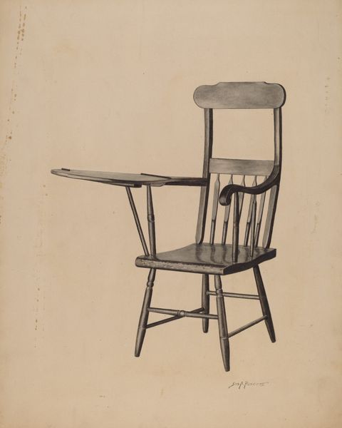 Curator: This piece is called "Baby High Chair", a watercolor created in 1938 by John Swientochowski. Editor: It has a kind of stark beauty. The muted green tones, almost gray, give it a solemn feel, like a monument to a past childhood. Curator: The austerity definitely speaks to the context of the late 1930s. We see the effects of the Depression on artistic subjects and the public appetite for pared-down, realist depictions of everyday life. These sorts of images had direct value in government programs of the era. Editor: Right. There is a vulnerability there too. Think of the inherent class and race dimensions of these images of domesticity produced during the New Deal and afterwards. Not all children were given equal conditions, or access to childhood itself. Whose children were benefitting from access to high chairs like this one? Who was excluded? Curator: Precisely, that perspective gives us important insight into its institutional function. We can understand how these images served specific ideologies, even in their quiet stillness. In this particular illustration, the chair appears devoid of its context; not quite abandoned, but not ready for a child to inhabit the space either. Editor: It feels almost haunted. Like a ghost of a child, who perhaps has even outgrown it and the promise of a bright future has dissipated. There’s so much meaning imbued in this solitary object. Curator: This makes me think of similar government programs like the FSA photography project documenting rural America. Artists were being given resources to observe, document and present life around them during those pivotal times in American history, Editor: Thinking about those intersections of art, governance and social critique makes an emotional piece all the more thought-provoking. Thank you for taking me to a space I hadn't quite conceived as a starting point before. Curator: Thank you. These types of everyday objects provide rich opportunity for exploration and I am thankful we got the chance to further analyze them and think through its meanings.