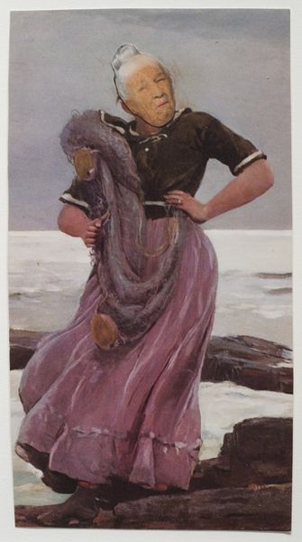 Editor: Here we have Jessie Willcox Smith’s watercolour illustration from 1919, “’Dear boy!’ said his mother; ‘your father’s the best man in the world’”. It feels like such a sentimental scene, a mother and child on the beach. What do you see in this piece beyond the surface sweetness? Curator: I see a fascinating snapshot of early 20th-century constructions of motherhood and masculinity, particularly within white, middle-class America. This wasn’t simply about depicting a loving scene; it was about reinforcing specific gender roles and ideals. What's interesting is how this image operates as both sentimental and ideological. Editor: Ideological? Could you expand on that? Curator: Of course. Consider the power dynamic at play. The mother, cloaked and almost shielding the child, presents the father as an unimpeachable figure. It’s less about organic emotion and more about establishing a patriarchal order through maternal affirmation. How does this sit alongside other images of its time? Were mothers having agency of this decision to speak highly of the father, or was this simply a role expected of them? Editor: I see what you mean. It's less about genuine connection and more about social scripting. It’s unsettling to see that expectation baked into a seemingly innocent illustration. Curator: Exactly! Smith’s piece, viewed through a critical lens, prompts us to question the subtle ways that art reinforces societal norms. Think about how ideas of the perfect family impact us today. Editor: So it’s not enough to appreciate the aesthetic qualities; we also need to unpack the underlying messages and the power structures they represent. Curator: Precisely! By interrogating these historical images, we can better understand the origins of persistent gender roles and begin to challenge their ongoing influence. Editor: Thank you. I will never look at such works with the same eyes again. It really enriches the experience.