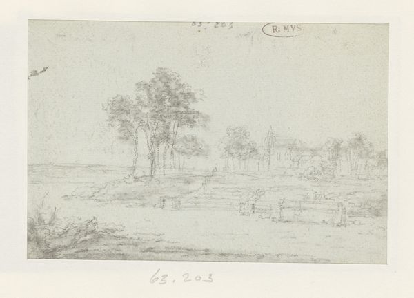 Curator: We're looking at Friedrich Metz's "Landschaft, im Hintergrund die Villa Borghese," a pencil drawing on paper completed around 1851 and currently housed in the Städel Museum. Editor: It has a certain calm to it, a simplicity achieved through very delicate pencil work. There's a stillness in the open field. You can feel the artist capturing a very particular moment in time. Curator: It certainly represents the sensibilities of its time. Think about the Grand Tour, the significance of Rome, and how artists sought to document its blend of ancient history and evolving modernity. The Villa Borghese, with its gardens, would have been a focal point. Editor: The texture of the paper becomes important, doesn't it? You can see where the pencil is layered. What I find intriguing is how the bare paper suggests atmosphere—a hazy Roman light. It shows us that even seemingly simple materials, pencil and paper, possess their own intrinsic properties and capacity for expression. Curator: That’s right. Also think about the social context: how travel and the availability of paper and pencils empowered artists to sketch en plein air, capturing these immediate impressions of landscape and architecture that later informed larger studio paintings. Editor: It brings to mind questions about the value assigned to sketches like these. Were they preparatory tools? Finished pieces? Today, we appreciate them for the direct link to the artist's process, a glimpse into their way of seeing. Curator: Indeed. What appears straightforward—a quick pencil sketch—is laden with historical, social, and material significance, reflecting the culture that produced both the artwork and its appreciation. Editor: Absolutely. This drawing prompts us to think about not just the subject—the villa and landscape—but also the very act of making, the artist's hand, and the role these seemingly minor works play in the broader art world. Curator: A worthy reminder of how a journey to document art becomes its own enduring piece. Editor: Right. The material rendering becomes part of history, just like the building it depicts.
