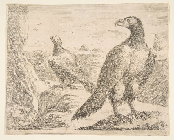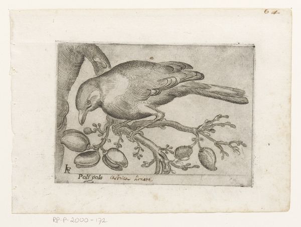 Curator: This print, entitled "Zwarte kraai," which translates to "Black Crow," was created around 1580-1590. It's an engraving, demonstrating the exquisite detail possible even without color. The artist is Jacques de Fornazeris. Editor: My initial feeling? Ominous. Stark, like a charcoal drawing discovered in a forgotten attic. There’s something deeply unsettling about the composition. Curator: It's a piece steeped in symbolism. The crow itself, historically, carries so much cultural baggage. It’s a fascinating study of Northern Renaissance sensibilities. We see here the bird of ill-omen paired with, yes, a skeletal form...likely an equine skull, wouldn’t you say? There are suggestions, too, of berries twining around the skull. Death and perhaps…a mocking life cycle? Editor: Precisely. The crow, perched so confidently, is not merely a bird but a symbol of something far more complex. Think of the period – the Renaissance grappling with plagues, social upheavals... this image speaks volumes about confronting mortality, the fleeting nature of earthly existence, a confrontation with ecological crisis! Curator: Absolutely. You could argue it is social commentary, if perhaps more indirectly. Crows in folklore are scavengers. So we might interpret this image as a critical assessment of, let's say, individuals exploiting or feeding off misfortune and, further, consider who those 'skeletal remains' were during this fraught historical period. A noble steed, maybe, ravaged by war? Editor: And that composition! The crow is positioned so prominently, almost as if it's observing us, the viewers, implicating us in the very scene it presides over. The detailed rendering of its feathers contrasts sharply with the simplified, almost crude depiction of the skull. This stark difference makes one reflect on beauty alongside decay. There is something deeply unsettling about being observed so keenly, by what is considered, generally, an 'ugly' subject, like a crow. It causes a lot of self-assessment! Curator: Right. A true Northern Renaissance spirit then, challenging accepted canons, prompting deeper reflection on societal fault lines, through animal forms… something both unsettling and profound. The fact that we're *still* drawn to it speaks volumes, no pun intended! Editor: Yes. Ultimately, the piece reminds me that grappling with difficult realities and deconstructing hegemonic thought structures may begin with honestly confronting these bleak, challenging images, not running away from them. Thank you, Monsieur de Fornazeris.