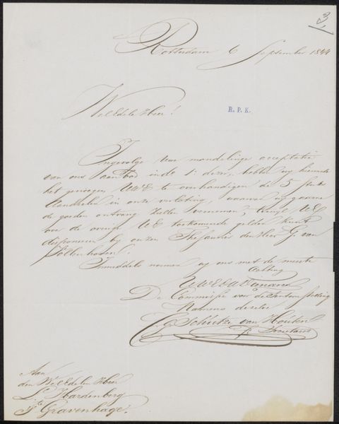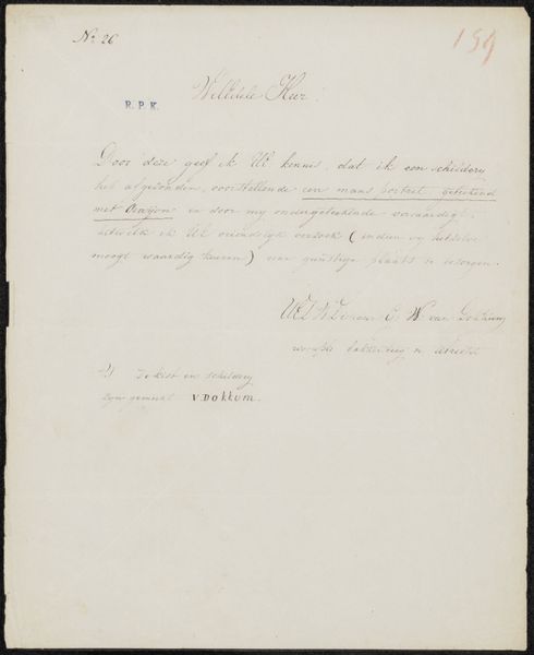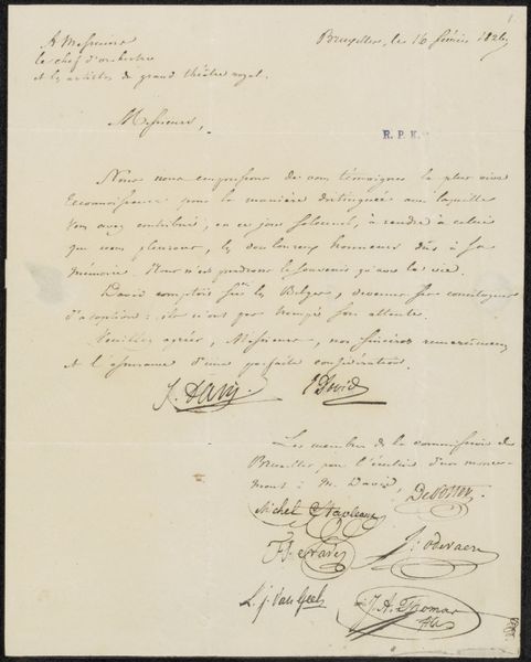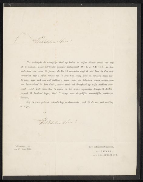 Curator: This is a fascinating piece – a membership certificate, "Lidmaatschapsbewijs van M.C.M. van der Vliet-Uitenhage de Mist," likely from 1839, originating from the Rijksakademie van Beeldende Kunsten. It’s executed in ink on paper. Editor: Immediately striking is the elegance of the script. The balance of the dark ink against the cream paper creates a strong visual hierarchy and evokes a sense of restrained formality. Curator: Absolutely. Think about the artisanal labour involved here. It’s not just the calligraphy itself, a highly skilled craft, but the preparation of the ink, the sourcing of the paper – elements easily overlooked when focusing solely on the artistic 'creation'. The document's existence signifies both institutional power and a recognition of a specific person’s contribution. Who was M.C.M. van der Vliet-Uitenhage de Mist, and what sort of network did that membership open up to her? Editor: The flow and rhythm evident within the swirls of each letter point to deliberate intention, yet maintain a natural organicism, so to speak, that tempers the geometric regularity typical of standardised documents. This combination is very aesthetically pleasing, drawing my attention toward those delicate hairlines as much as the bold downstrokes. I like that juxtaposition of order and freedom! Curator: Right. Considering the paper's materiality: its probable rag content indicates high status, emphasizing the Academy's importance in 19th-century Dutch society. Consumption patterns dictated access. The act of inscription with expensive ink turns mere paper into an instrument reinforcing class structures and cultural hierarchies. Editor: It reminds me also that semiotics considers a visual element, such as a calligraphic signature or printed seal, functioning to communicate messages, assert authenticity, and ultimately, solidify structural meanings or hierarchical placement by confirming validation with its visual elements and language. Curator: It prompts a reassessment beyond aesthetic judgments and more to explore the conditions that permitted this work's material existence and enduring appeal. Editor: Yes, this gives a rich insight into society and status through a piece of calligraphy!