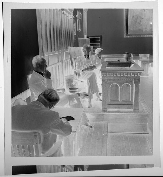 Editor: This is Jack Gould’s “Untitled (two businessmen in office),” a small black and white photograph in the Harvard Art Museums collection. It's quite stark, almost ghostly. What strikes you about this image? Curator: The image speaks to the mid-century corporate culture, doesn't it? Consider the power dynamics embedded in the photographic gaze. One man stands, almost presenting himself, while the other is seated, immersed in paperwork. Editor: Yes, I see what you mean. It's like a performance of corporate identity. Curator: Precisely. And notice the institutional setting—the blinds, the desk. How does the architecture contribute to the narrative of control and authority? Editor: I never considered that before, it adds a new layer of meaning. Curator: Indeed. The image reflects how social structures are manifested in seemingly mundane settings.