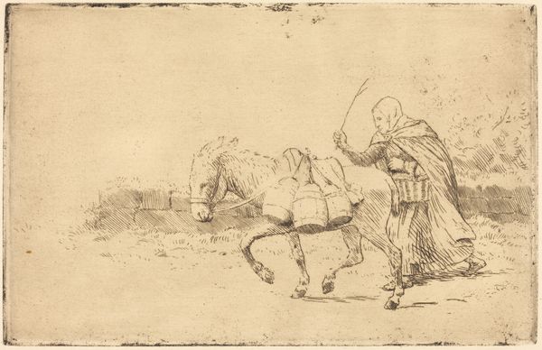 Curator: This drawing from the early 17th century by Adam Elsheimer depicts a dramatic scene. The work, rendered in pen and ink on paper, is entitled "Bileam op zijn ezel ontmoet de engel," or in English, "Balaam on his donkey meets the angel". Editor: Oh, wow! I'm immediately struck by the dynamism. You can almost feel the donkey balking. And the angel--intense! There’s this great, raw energy about the strokes. It looks so immediate and… urgent, I guess? Curator: Absolutely. The subject matter, taken from the Book of Numbers, highlights themes of disobedience and divine intervention, issues that resonate in different times and settings. We can explore Elsheimer’s construction of power in the way that he positions the angel. It can reveal how he reflected socio-political climates, thinking about justice, fate and personal agency at the time. Editor: And speaking of construction, look how Elsheimer uses light and shadow. It really emphasizes the supernatural drama. And, I just love the almost cartoonish surprise on the donkey’s face. Is that okay to say? Does it sound ridiculous? Curator: Not at all. Understanding how popular narratives work to emphasize particular ideals, that might be just the connection. It serves to create an effect in which it heightens our ability to recognise a kind of caricature. This image does that. If Elsheimer lived in the 21st century, I could totally see him doing political cartoons, in fact! Editor: Okay, good. But there’s also something so delicate and personal about a drawing like this. You get this insight into Elsheimer's thought process. I find myself wondering about his daily life. What else did he see and think about when he was alone in his studio? Curator: That personal element speaks to the tradition of humanist philosophy that emerged from the Renaissance, which centered the importance of self-discovery, human expression and the importance of the natural world. With works like these, we find moments in the re-shaping of subjectivity. Editor: Thinking about what this artwork represents, and also how, what else is there? I wonder... Curator: Its continued relevance is a testament to the enduring power of art to capture those perennial issues about ourselves and the divine at particular intersections in history.
