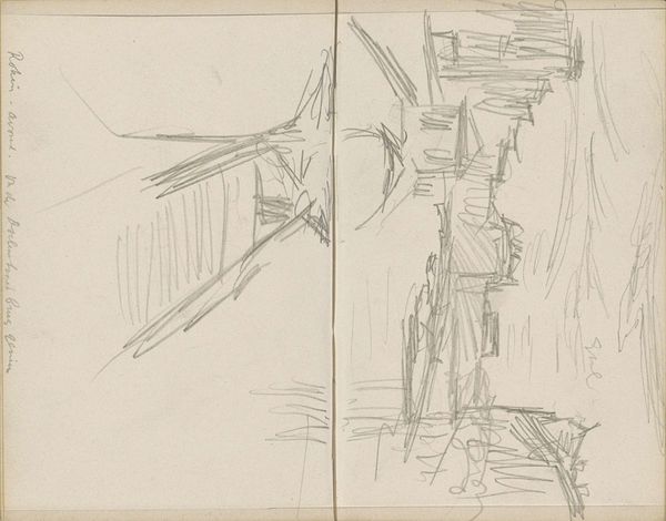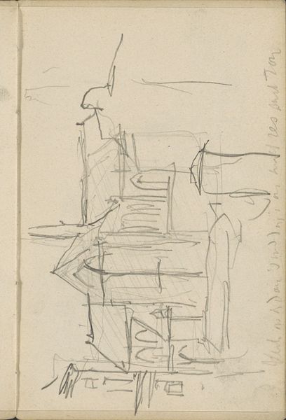 Curator: Hmm, chaos, maybe? A scribble of captured movement? Editor: This is a sketch titled "Aangemeerde boot, mogelijk een schuit" – “Moored boat, possibly a barge” – created sometime between 1886 and 1923 by George Hendrik Breitner, held here at the Rijksmuseum. The medium appears to be pencil on paper. Curator: It's so…unfinished. A ghost of a boat. Breitner caught it like a thought drifting away. Is that even a boat? It's a beautiful mess. The eye doesn't quite know where to settle, does it? I like that feeling. Editor: This reminds me of the role of sketches in the development of artistic projects, and their intimate value as exploratory works, particularly considering Breitner's wider oeuvre capturing Amsterdam street life and labour. One could ponder on what specific meanings barges and boats carried for harbour communities in the Netherlands, and what function this work fulfills as a preparatory exploration. Curator: You know, seeing it like this, as prep, I almost like it more! I imagine Breitner here, just grabbing this snippet of dockside life. Not trying to immortalize the barge, just to…feel it, you know? I feel like I can actually glimpse his thinking in the pencil strokes. It is, in that sense, far more spontaneous than more accomplished works. Editor: Right, this piece challenges notions around completion and the canon. I wonder, though, how does an artist decide which sketches have value, deserve preservation? So many, likely, get lost. Whose stories are not being preserved as a result? Curator: Perhaps, the "imperfect" artworks allow future viewers to access a deeper layer of honesty and the vulnerability in creative pursuit. I suppose those are my favourite aspects. It also asks "Who is art for?" The final product is certainly intended for more widespread appreciation, while the early sketchbook stages could arguably have value for its creator above all else. Editor: I agree. This makes me think about visibility, about who gets remembered, what art gets prioritized in archives and collections like the Rijksmuseum—and why that matters today. Curator: Well, it definitely gives you something to mull over, doesn't it? A sketch, a question mark, a bit of a puzzle, just like life, I think. Editor: Absolutely. This small drawing holds big implications when considering the narratives around artmaking itself, questioning the art we see versus that which has been deemed secondary and disappears from sight.