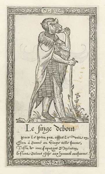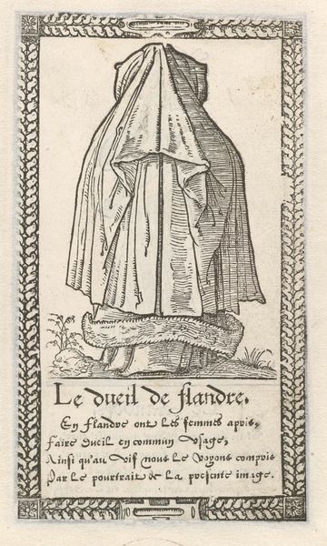 Curator: Isn't it captivating? "Dame uit Turkije," or "Lady from Turkey," an engraving by François Desprez, dated 1562. It’s so exquisitely rendered! Editor: It does possess a certain understated dignity. Stark, graphic, almost… icy in its presentation. What’s most compelling to me is its context as a print. Curator: Right! Its purpose. In Renaissance Europe, such prints served as vital, accessible forms of disseminating information. Editor: And fashion! This engraving isn’t just art; it's a document of cultural exchange, or perhaps more accurately, a Western interpretation of Ottoman aesthetics. The fine lines delineate not just the woman’s form, but the intricate textures of her garments, all achieved through skilled labor. What’s she holding in her right hand? Curator: Looks like a stylized rose, doesn’t it? It is almost rigidly held as if a statement about cultural ornamentation and symbol, don't you think? Editor: Absolutely. Every choice—from the framing border to the very cut of her dress—speaks to an encounter with the ‘other.’ Desprez wasn't just capturing an image; he was packaging and selling an idea of the Orient for consumption. Consider the material itself—paper, ink, the press… all crucial in reproducing and distributing these images widely. Curator: It definitely offers us such an important window onto the mindset of the time, I'd agree with that for sure! This image, while simple in its execution, speaks volumes about identity, perception, and the power of representation, and how we often don't quite catch up with the past on the way it perceives! Editor: Indeed, even the survival of this print across centuries reflects processes of curation, trade, and perhaps even chance encounters between it and those who deemed it worth preserving. Its simple materiality holds so much historical weight. Curator: Absolutely. It reminds us that even the seemingly smallest of objects can be imbued with a potent history. Editor: Agreed. This 'Lady from Turkey' offers us more than just a portrait, it also asks so many question about labor and value, it provides also an economic look at what went into making images.