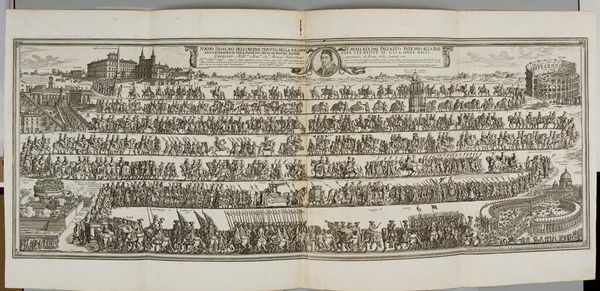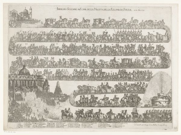 This print, made by Giovanni Battista Falda in 1671, depicts the grand entrance of Pedro Antonio de Aragón into Rome. The technique here is etching, a printmaking process where lines are incised into a metal plate, often copper. These lines hold ink, which is then transferred to paper under great pressure. Falda has used this process to its full capacity. Notice the meticulous detail of the figures, horses, and architectural elements. The linear quality and tonal range of the print directly result from the controlled corrosion of the metal plate. Think about the labor involved: from the initial design to the skilled execution of the etching, and the final printing process. The work captures the pageantry of the event, but also reflects the complex social hierarchy of the time, the power of the ruling classes, and the sheer amount of human effort required to produce and celebrate such occasions. This print is not just a representation of an event, it's a document of labor and social order.