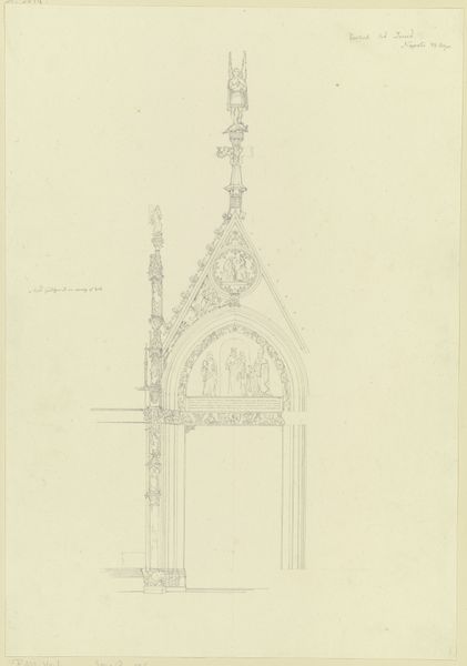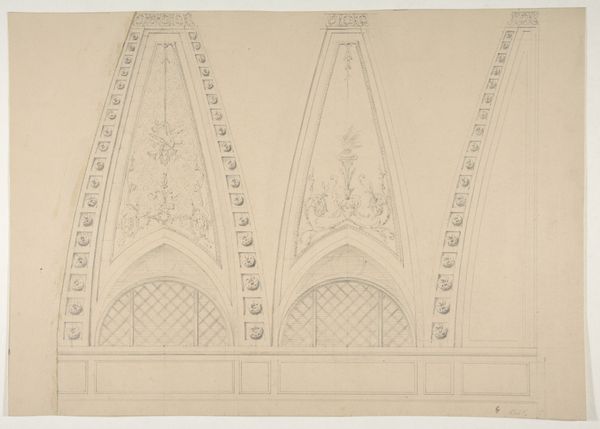 Editor: This is Karl Ballenberger's "Studienblatt_Maßwerkfenster in Frankfurt am Main," a drawing in pencil and ink. It looks like a study of gothic window designs. I’m struck by the precision and the almost obsessive detail of the tracery. What do you see in this piece? Curator: Beyond the obvious technical skill, I see a yearning for order and a fascination with structure typical of its time. Think about the socio-political context – the rise of industrialization, shifts in religious authority. How might these delicate, geometric forms offer a sense of stability or perhaps even resistance against that backdrop? Editor: So, you are saying that the drawing of the window provides some resistance? Curator: Precisely. These windows, initially designed to let light into sacred spaces, often represented wealth, power, and divine connection. Ballenberger, by meticulously studying and documenting them, may be participating in a larger discourse about who controls knowledge, beauty, and ultimately, spiritual experience. Editor: That's an interesting interpretation! I was focusing on just the shapes, the lines, and not the intention or cultural setting that influenced Ballenberger. Does his rendering style suggest anything about his perspective? Curator: The emphasis on line suggests an interest in capturing the *essence* of these windows. The tracery patterns weren't simply decorative; they held symbolic meaning related to religious beliefs and philosophical principles. This isn’t just an architectural study, it's a study of power encoded in form. Think about it: Who has access to these spaces? Whose stories are told through these designs? Editor: That makes me think about the legacy of cathedrals, both then and now. Thank you. Curator: Absolutely! I'm glad to have perhaps helped you examine architecture as a language—encoding social and cultural narratives beyond their visual qualities.