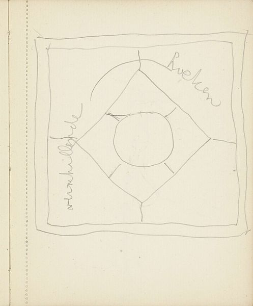 Curator: Here we have "Decoratief patroon met driehoeken," or "Decorative Pattern with Triangles," a pencil drawing on paper made sometime between 1916 and 1945, now residing at the Rijksmuseum. Editor: Ah, yes. It's so light, so airy...almost like a preliminary sketch of some forgotten architectural detail. The pencil lines are so delicate; I feel as though a gust of wind could erase them. Curator: Indeed. The work feels provisional, as if the artist, Reijer Stolk, was experimenting. I see a horizon line above and below a repeating motif of triangles. There also seem to be little doodles inside. Editor: I'm especially drawn to the marks *inside* the triangles – X’s and O’s playfully interrupt the clean lines, introducing a human element that contrasts with the rigidity of geometric shapes. Is there writing, too? It almost looks like shorthand… Curator: Yes! Some cursive text. My understanding is these were notes on various textile colours. One can only imagine how these experiments served a purpose to the artist when considering new pattern applications. The "Decorative Pattern" reads now more like a record, in the tradition of the sketchbook rather than high modern abstraction. Editor: So, a bridge between pure geometric form and practical application in decorative design? It speaks to how the "fine arts" constantly borrow from and elevate the so-called "applied arts," blurring the lines of high and low culture. Makes me wonder who might be considering pattern application from architecture today. Curator: Absolutely! The Rijksmuseum holding onto this object speaks to its importance as more than a draft, its an indexical record and source document for what we come to understand is good design in its historical context. Editor: In closing, what began as a simple sketch becomes a gateway to considering art and society, then. I’ll definitely walk away considering the context and the conditions when viewing abstract art. Curator: For me it signals an invitation to reconsider the potential locked away in even the most ephemeral drawings—reminding us to value all works as expressions of lived life.