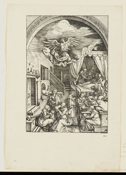 Editor: Here we have "Boekverbranding," created by Romeyn de Hooghe between 1650 and 1708. It appears to be a pen-ink sketch. The scene is quite striking, quite ominous, depicting a public burning of books. What draws your eye when you look at this, from a formalist perspective? Curator: Formally, my attention is directed by the artist's use of linear perspective, anchoring the architectural elements in the background. Notice how de Hooghe uses line weight to suggest depth, creating a recessive effect? Editor: Yes, the background does seem to fade a bit, creating space. How does that recession affect the overall meaning, given the harsh subject matter? Curator: The sharpness of line in the foreground emphasizes the book burning itself. Observe the figures—the linear precision describes their garments, distinguishing them with a coldness. The burning itself disrupts this rigidity; consider how that textural contrast invites a certain visceral reading. Does the flame serve a structuring function? Editor: I see, it almost creates a focal point due to the looser lines. Would a formalist interpretation typically avoid delving into any political implications implied by the burning? Curator: Not necessarily, it is about examining how those implications are manifested *within* the artwork's formal qualities, or, say, how a formal reading elucidates a possible cultural function. So the focus remains the relationship between parts to a whole; the how not the why. Editor: That distinction is becoming clearer to me. Seeing how de Hooghe uses lines and perspective shifts my attention to elements I previously overlooked. Curator: Indeed, attending to the artwork's own internal structuring—that is, its formal properties—helps unlock potential.
