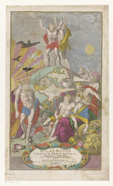 Editor: This is William Blake's Frontispiece to ‘Visions of the Daughters of Albion’ from the Tate Collection. The figures seem trapped, almost sculptural. What do you see in terms of the composition and form? Curator: Note the stark contrast between the muscular figures and the ethereal, almost dissolving, landscape. Observe how Blake uses line and color to create a sense of confinement and psychological tension. The figures are arranged in a pyramidal structure, suggesting a classical influence, yet the execution is uniquely Blake's. Editor: It’s interesting how the bodies are so defined, yet the background is so fluid. Curator: Indeed. Blake masterfully juxtaposes the solidity of the human form with the ephemeral nature of the visionary realm. The limited palette further emphasizes this tension, focusing our attention on the interplay of light and shadow across the bodies. The color is not illustrative, but structural. Editor: I see that contrast more clearly now, thank you. Curator: My pleasure. Consider how the formal elements contribute to the overall meaning and emotional impact of the work.