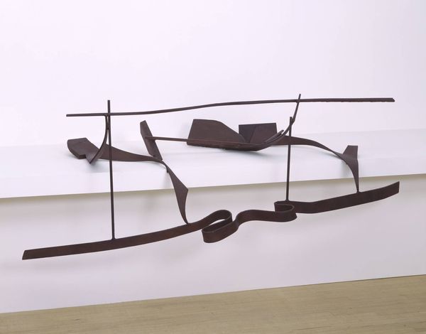 Editor: Here we have William Tucker's 'Shuttler B,' currently held at the Tate. The shapes are so simple, almost childlike, but the dark color and massive scale give it a serious, almost brooding presence. What do you see in this piece? Curator: The sculpture echoes prehistoric building forms—dolmens, early shelters. Notice how the timbers meet, forming a protective enclosure. This evokes a primal sense of home, of sanctuary, wouldn't you agree? Editor: I do see that now, like the frame of a house. A very abstract house. Curator: It transcends mere shelter, though. The skeletal structure implies something more – a cultural memory of building, a symbolic representation of our need for protection and belonging. What does that mean to you? Editor: It’s interesting to think about the deeper meanings in something that looks so simple. Curator: Exactly! We often unconsciously embed powerful symbols and ideas within even the most abstract forms.