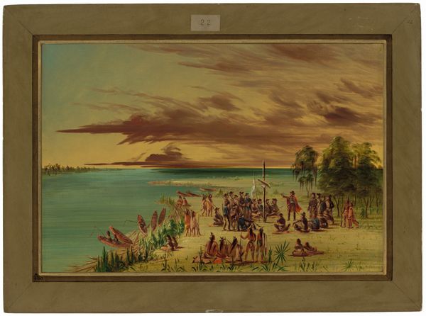 George Catlin painted "The Expedition Encamped below the Falls of Niagara" using oil on canvas. See how the falls, rendered in a muted palette, form a subtle backdrop to the bustling encampment. The waterfall, a powerful symbol of nature's force, has appeared throughout art history – from classical landscape paintings to modern photography. Consider its duality: it is both destructive and life-giving, a paradox that taps into our deepest anxieties and awe of the natural world. Note the figures in canoes navigating the waters, a motif that appears in various forms across cultures. It echoes images of voyages and quests, from the ancient Egyptians crossing the Nile to Charon ferrying souls across the River Styx. These archetypal journeys reflect our subconscious yearning for exploration and transformation. Even today, we see this motif recurring; each time it resurfaces, it brings with it a mix of hope, fear, and the eternal human drive to push beyond the known.