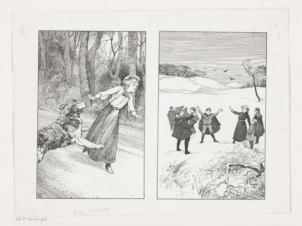 Curator: The Rijksmuseum holds this interesting drawing. It’s titled "Meisje schrikt van hond" – "Girl startled by dog", if you will – dating roughly from 1870 to 1937, by an anonymous artist. The artwork involves pen and ink on paper. Editor: What strikes me is how unsettling the image feels despite its commonplace subject matter. The stark monochrome, the exaggerated poses… it evokes a deep-seated fear, a primal aversion to the unexpected. Curator: Indeed. The depiction of the startled girl resonates with prevailing Victorian sensibilities, where composure and control, particularly for women in the public sphere, were highly valued. Losing control was practically a social sin! The unleashed dog represents chaos invading order, threatening the social structure. Editor: Visually, the dog lunging feels like an embodiment of id meeting superego. We see her in a carefully constructed, almost restrictive outfit. That massive skirt suggests repression but now juxtaposes violently against the wildness of this canine. The symbolism taps into cultural anxieties of that period, as well as something fundamental about our personal boundaries being breached. Curator: That's astute. There’s also an interesting play on visual conventions. Genre paintings were frequently idealized, meant to depict domestic harmony, reinforcing social ideals. But this drawing turns the genre on its head by illustrating a disruption of such expected harmony, thereby highlighting the artificiality of it. Editor: It's almost as if the artist intentionally undermines the sweet imagery typical in popular culture to depict a more visceral reality. Her wide eyes say everything. Is the artist making commentary on the expectation that young women, as members of high society, always appear calm, well mannered, or gracious when they most certainly don't feel that way internally? I feel it very well might. Curator: Precisely. Anonymous as the artist is, we can clearly observe a very clever understanding of how art mediates and responds to very palpable tensions within its society. Editor: And within ourselves. Makes one think about how symbols around chaos affect everyone, regardless of when or where they live. It will be something to continue musing about after moving on from here, certainly. Curator: It leaves you appreciating how this image opens to interpretation of its time and place, doesn't it?