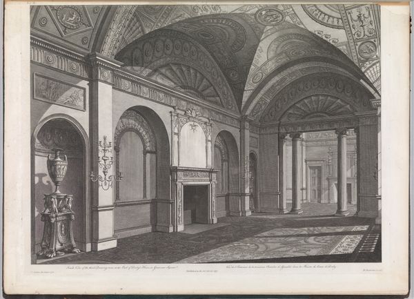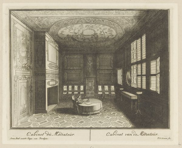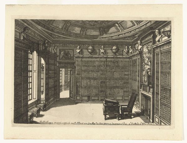 Curator: Looking at "Interior of a Library" from "Nouveaux Liure da Partements," part of “Oeuvres du Sr. D. Marot,” created between 1703 and 1713 by Daniel Marot the Elder. What springs to mind for you? Editor: A profound sense of intellectual containment. It's a meticulously rendered space, yet the sheer volume of books, those countless spines, presses in. It speaks of knowledge as a constructed, almost oppressive force. Curator: That's fascinating. The artist used engraving to create the illusion of depth, crafting a kind of architectural fantasy, designed more as aspirational prospect than a truly habitable area. The crisp lines articulate the baroque details of paneling, busts, and of course, those serried ranks of books. Editor: For me, it raises questions about access and patronage. Who commissioned this? Who was meant to inhabit—or perhaps merely aspire to—this idealized space of learning? Were these commissions reflective of actual library builds? It seems tailored to showcase the wealth and erudition of an elite. Curator: Certainly. Prints like this disseminated architectural trends and shaped elite taste. Daniel Marot was hugely influential in his day and his influence as designer of furniture, interiors, and gardens extended across Europe; this type of image demonstrates how these designs were disseminated and re-imagined. The act of representing it through engraving removes the immediacy of handcrafted materials and re-presents the ideas for mass distribution. Editor: So the material reality gives way to the ideal. How fascinating that the means of production – the very print itself – is complicit in distancing us from the embodied experience of the room. A print designed to represent the tangible in a intangible way. Curator: Precisely. The choice of engraving as a medium, allows Marot to control its production and tailor distribution—the library is both a real space and a social construct, accessible only to those within particular circles of influence and affluence. Editor: Reflecting on its modern-day display, this print in its current museum setting allows it to now be admired outside the immediate confines of class, wealth, and original socio-economic position. Curator: Indeed, our modern, public access shifts its role again! The lifecycle of art and material continues its transformative arc.