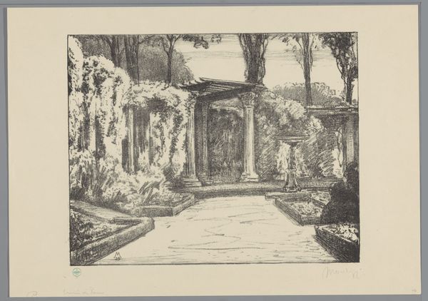 Editor: Joseph Pennell’s "Cumberland Terrace, Regent's Park," created in 1905 using etching, offers a glimpse of London's architecture. It feels like I’m peering into a fading memory, with its delicate lines and tonal range. How does this etching's formal composition guide our reading of the work? Curator: Indeed. Notice the carefully constructed perspective, with lines converging to create a sense of depth, despite the shallow space of the print. The repetition of the columns and arches rhythmically articulates the facade of the terrace, further constructing a structured and ordered visual field. How does the artist manage the relationship between light and shadow? Editor: The light seems to delicately wash across the architecture, creating soft shadows. It is all very subtle, isn’t it? The variations in tone emphasize the three-dimensionality of the structure while also suggesting the atmospheric effects of light and air. It also adds a layer of ambiguity. Curator: Precisely. This considered manipulation of tone is used to define form. The formal qualities—line, tone, composition—contribute significantly to its overall affect. What would you say this adds to the work overall? Editor: That it becomes less about place, and more about Pennell’s visual exploration of line and light as well as a perspective onto London. Curator: Precisely. The focus isn’t merely representational, but on how visual elements can evoke a certain aesthetic experience, through these forms and lines alone. The print almost self-reflexively demonstrates the visual language of form and how this then effects understanding and emotion. Editor: That makes so much sense. I was stuck on just reading it as a landscape of London but this opens a new avenue for looking at the art as just form. Curator: Absolutely, and it underscores how focusing on the intrinsic visual elements unlocks further layers of understanding of an artwork.