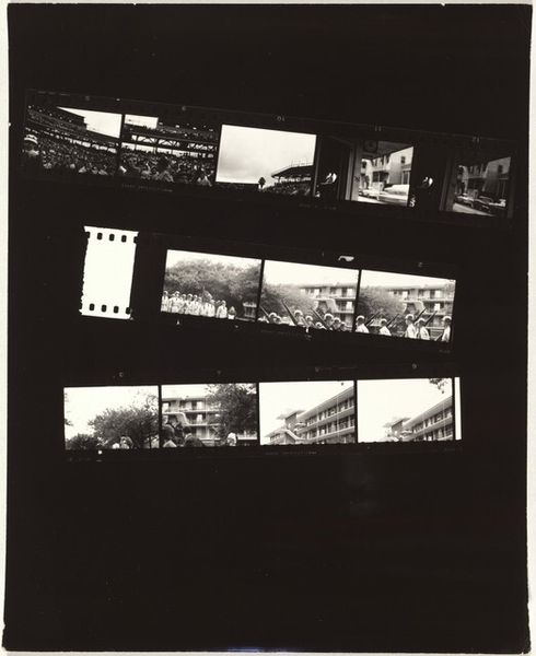 Curator: Gordon Parks's photograph, "Place de la Concorde, Paris," taken after 1951, presents a striking vista of Parisian life, captured in monochrome. Editor: It's instantly evocative, isn't it? A wet, glimmering Place de la Concorde… the cars like little beetles, hurrying across the scene. There’s almost a sense of melancholy despite the activity. Curator: Indeed. Parks was a master of imbuing seemingly ordinary scenes with a deep emotional resonance. Notice how the high vantage point compresses the space, creating a sense of dense urban life unfolding beneath a brooding sky. The formal elements work beautifully: the geometry of the Place itself— Editor: Precisely! Look at the organization. The central obelisk anchors the composition. Parks expertly uses diagonal lines of converging vehicles to pull us into the depths, toward those elegant buildings of the Parisian skyline in the distance. It's dynamic. Curator: Parks often used the city as a stage, didn’t he? His black and white photography strips away the color, making us focus on the textures, the light, the stark reality. It reminds me a little of early Doisneau but somehow feels harder. Parks always had an agenda— Editor: True, though here the political subtext is subtle. But think of semiotics. The car could represent movement, modern life; also, economic progress contrasted against that looming sky—almost Old Testament. Even in greyscale, the photo generates considerable emotional charge, reflecting the city as simultaneously gorgeous, yet ominous, even alienating. Curator: Ultimately, a piece about observation: Parks looked with the eye of a man seeking both beauty and truth and distilled it all into a timeless image of the city of lights…even in shadow. Editor: Yes, a truly memorable encapsulation of urban dynamism caught in monochrome. It’s a stark, lovely dream— or perhaps a vision of our times.