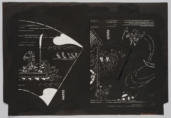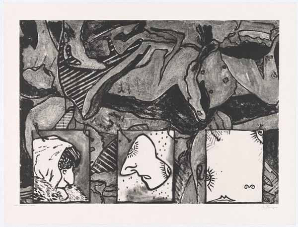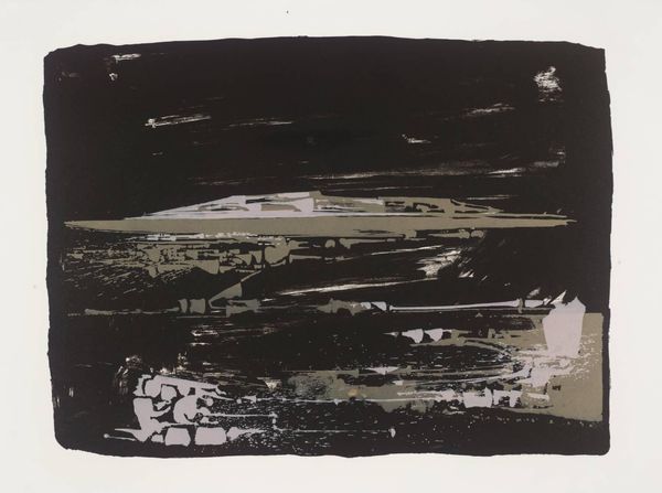 Editor: This is John Piper's "11. Inglesham, Wiltshire: A Rustic Medieval Interior." I’m really struck by the composition. It's almost like an abstract stage set. What do you see in this piece? Curator: The formal qualities are quite compelling. Note the stark contrasts between the monochrome blocks and the textured surfaces. Observe how Piper creates depth through layering and the strategic placement of shapes. The limited color palette reinforces the architectural subject matter. How do these elements contribute to the overall reading? Editor: It feels very architectural, almost like blueprints or fragmented memories of a building. Curator: Precisely. It is interesting to consider how the artist uses abstraction to capture the essence of a space, rather than a literal representation.