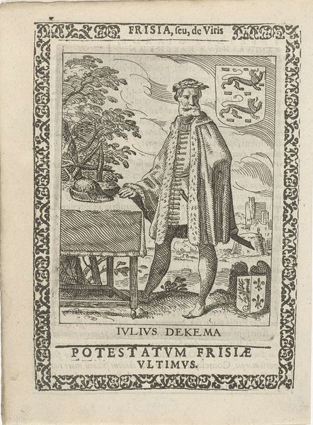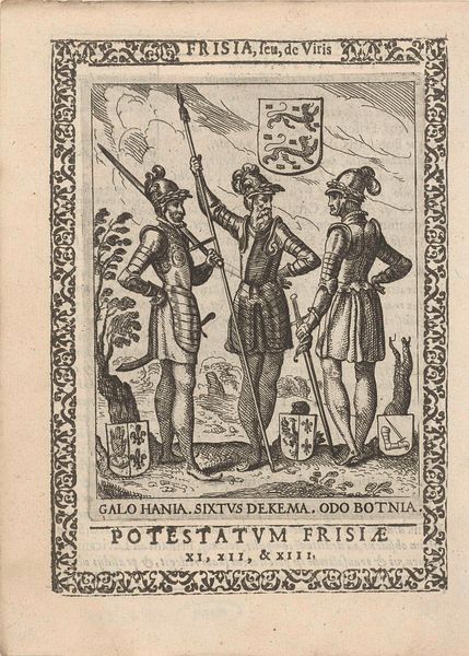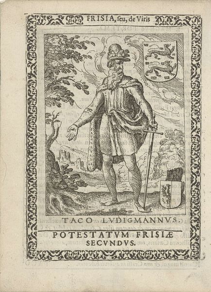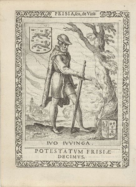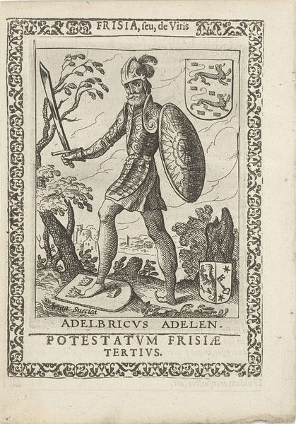Curator: Let's discuss this fascinating engraving of Reinier Camminga, eighth Potestaat, or Governor, of Friesland. Pieter Feddes van Harlingen created this work between 1618 and 1620. It's currently held at the Rijksmuseum. Editor: The first thing that strikes me is the direct gaze, almost challenging, and the tension between the military bearing and that sprig of leaves he holds. It's an odd combination. Curator: The prints like these were very much tied to establishing a lineage of power, of visualizing authority. Notice the coat of arms above him—heraldry served as a crucial tool for asserting social status and legitimacy in early modern Europe. The imagery becomes a shorthand for power. Editor: Exactly, and who gets to be represented and how is key. It is a power play. Camminga is portrayed as a powerful figure, yet the Northern Renaissance style reminds me of the limitations of that power, doesn’t it? Everything’s meticulously detailed, yet stiff. Is that the limits of the printing process, or the limits of imagining authority? Curator: A bit of both, perhaps. The conventions of the time certainly played a part. Portraiture like this functioned as propaganda, influencing public perception and reinforcing social hierarchies. His dress, though maybe stiff to us, sends a clear message about wealth and martial prowess. Editor: Still, that sprig… It seems a deliberate attempt to soften the image, perhaps an attempt at reconciliation after conflict? Or is it simply an allegory of peace through strength? It would be interesting to delve deeper into the contemporary context in Friesland. Were there particular conflicts, succession issues perhaps, that this imagery responds to? Curator: It also invites questions about intended audience. Prints like this were often circulated amongst an elite group, solidifying a sense of shared identity and values within that class. They functioned as markers of distinction and belonging. Editor: Considering how image politics work even now, it highlights that image management and representation is really about access, who is being seen and on whose terms. Curator: A really apt connection. Examining prints like this reminds us how strategies for crafting public images aren't necessarily new, even in the age of social media. Editor: Indeed. Thinking about Reinier Camminga, this engraving invites reflection on power, symbolism, and the intricate dance between historical context and contemporary resonance.