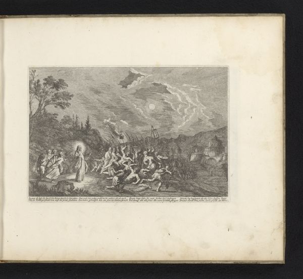 This is "Vreugdevuur met dansende dorpelingen," made by Jules David. In this print, our eyes are drawn to the stark contrast between the dark, densely etched figures and the bright, open space created by the fire. The composition is carefully structured, with the village scene arranged in a semi-circle around the bonfire, leading the viewer's gaze towards the light. David uses a classical approach here, where the light source doesn't just illuminate but also reveals form and structure. The human figures are captured in active poses; they are not merely placed but purposefully arranged, enhancing the lively, energetic atmosphere. Notice the architectural lines of the building behind the bonfire; this structural element adds a sense of stability to an otherwise dynamic scene. This print isn't just a depiction of a celebration but a structured interplay of light, shadow, and form, inviting us to consider how the formal elements of art can animate a scene and engage us in its narrative.