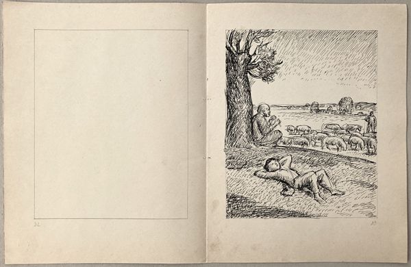 Curator: This delicate image comes from Suzuki Harunobu's "Picture Book of Seasoned Grass: Waka by Famous Poets," part of a three-volume set. Editor: It feels so… wispy! The lines are like breath, barely there, giving everything a dreamlike quality. Curator: Harunobu, working in the 18th century, was a master of woodblock printing, and this exemplifies the elegance and refinement he brought to the medium. The scene depicts a humble interaction: a figure with a horse, set against a landscape with calligraphy overhead. Editor: The calligraphy almost floats, like the poems themselves are part of the scenery. It's a gentle reminder that even the simplest image can hold profound meaning. Curator: Indeed, it’s fascinating how the imagery and text work together, creating a space for reflection on nature, labor, and the artistic traditions that bind them. Editor: It's left me feeling oddly peaceful, like I’ve just glimpsed a quiet corner of the world.
