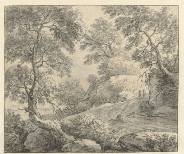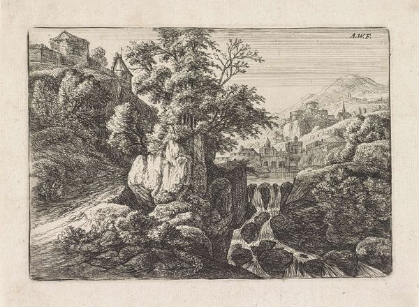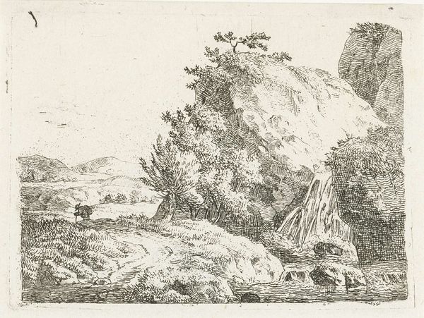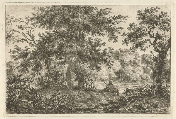 Editor: We're looking at Anton Kölbl's "Man and Boy Walking Along a Road," an etching from the Harvard Art Museums. The intricate linework creates such a serene and pastoral scene. What compositional elements stand out to you? Curator: The composition relies heavily on contrasting textures and densities. Notice the delicate, almost skeletal trees on the left, juxtaposed against the solidity of the rocks on the right. Editor: Yes, there's a real push and pull between those elements. Curator: Indeed, the artist’s considered use of line weight and density creates spatial depth, guiding the eye through the landscape. The figures, though small, add a vital human scale. Consider how the artist uses the bounding line, which flattens the image while still creating an intimate view. Editor: I hadn’t considered the bounding line like that. It’s interesting to see how it both contains and defines the scene. Curator: Precisely. The tension between the implied depth and the picture plane creates a dynamic visual experience, prompting us to contemplate the relationship between man and nature. Editor: This has given me a much deeper appreciation for the careful consideration of the artist's choices in this work.