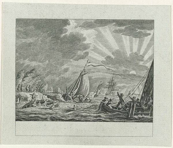 This etching by Reinier Vinkeles depicts the tragic drowning of Prince Johan Willem Friso in 1711. The turbulent sea, a recurring symbol of chaos, is rendered with dynamic lines, immediately evoking a sense of foreboding and doom. Throughout history, the sea has been a powerful symbol of both life and death, a motif that resonates deeply within the human psyche. We see it in ancient Greek tragedies, where shipwrecks often foreshadowed or mirrored personal and political downfalls. This imagery taps into our collective memory, stirring primal fears of the uncontrollable forces of nature. Notice the survivors clinging to the wreckage, a scene reminiscent of countless maritime disasters immortalized in art. This motif reminds us of our shared human vulnerability in the face of nature's might. Such scenes are not merely historical records; they are potent symbols that continue to resurface and resonate, reminding us of our precarious existence.