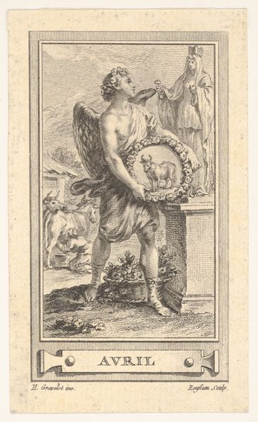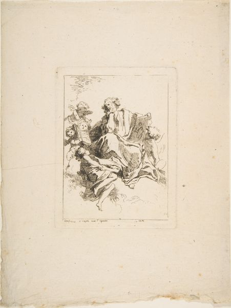 Editor: Here we have Jost Amman's "A Seated Personification of Charity with two Children," dating from sometime between 1539 and 1591. It’s a print, a pen-and-ink sketch. I find it really striking how this image, even rendered so simply, manages to convey such tenderness. What symbols or imagery jump out at you? Curator: Immediately, the very subject matter proclaims a well-worn iconography. Charity, or Caritas, as personified in this engraving, carries immense cultural and psychological weight. The nursing mother with children…does it bring to mind other, perhaps older, images? Editor: Yes! It reminds me a little of images of the Virgin Mary and Jesus. Curator: Precisely. This echoes earlier depictions, drawing a direct visual parallel, imbuing Charity with a maternal holiness. Look closely at how she’s situated – elevated on a plinth, set within an oval frame. Do those details resonate for you? Editor: The plinth definitely makes her seem more important, more…monumental. And the frame feels protective, like she's something precious to be preserved. Curator: Indeed. Amman deliberately situates Caritas not simply as a woman but as an enduring ideal, an emblem of a societal value. Note also the turbulent folds of drapery. Doesn’t it imply the ceaseless movement of generosity? Editor: Now that you mention it, the dynamism in the folds really does counter the static setting. So it's about making something eternal feel alive? Curator: Absolutely. This reflects how visual symbols can simultaneously recall tradition while remaining relevant to present-day emotion and cultural need. Jost Amman creates this resonance in a highly original manner. Editor: I see what you mean. It's a powerful synthesis of symbolism and skillful execution! Curator: Exactly. The beauty and wisdom in visual language, accessible to every level of awareness, but so greatly enhanced by scholarly exploration!