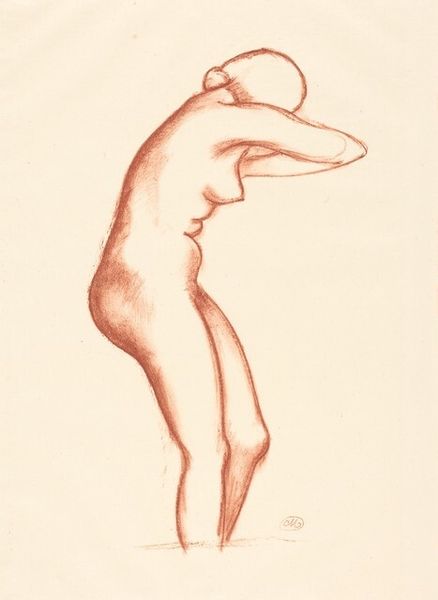 Curator: Aristide Maillol's "Ovid's 'The Art of Love'" from 1935 is before us, rendered in sanguine pencil. What’s your initial take? Editor: Well, there's an undeniable vulnerability here. The turned back, the averted gaze...It makes me consider ideas of power dynamics within artistic representation, especially with the classical subject matter. Curator: Absolutely, though let's first acknowledge how skillfully Maillol balances mass and line to suggest volume with such minimal means. Notice how the gentle curves delineate form and emphasize the figure’s roundness. Semiotically speaking, this embodies the classical ideal of beauty that he continuously pursued. Editor: While I see that formal elegance, I find it hard to ignore the larger conversation it invokes. Who is this ‘ideal’ serving, who is excluded? It invites a critical dialogue concerning the male gaze and its historical implications for female self-perception. Curator: Of course, but to understand his contribution we need to appreciate the internal formal language at play here: line weight, tonal modulations and anatomical exactitude. In itself it's an interesting structural proposition in its almost unfinished rendering and how Maillol leaves open space for interpretation. Editor: Fair enough, but art never exists in a vacuum, right? How can we extricate Maillol's aesthetic choices from their social consequences and philosophical underpinnings? Isn't this idealized form complicit within those unequal systems of visual representation and meaning-making? Curator: I will say, it invites endless interpretations and even opposing standpoints depending on which school of theory we're drawing from, doesn't it? Editor: Indeed. It's a potent reminder that every artwork has multiple entry points depending on our perspective, politics, and theoretical lens. Let’s continue down that road as we approach the next piece...