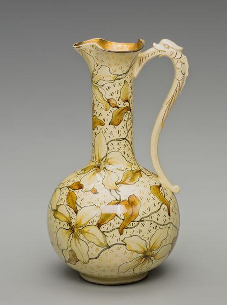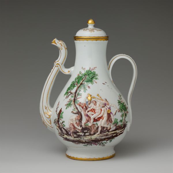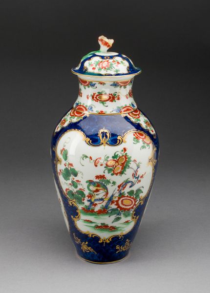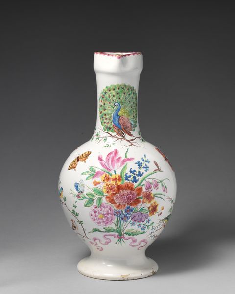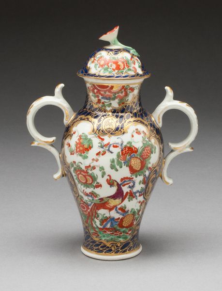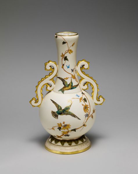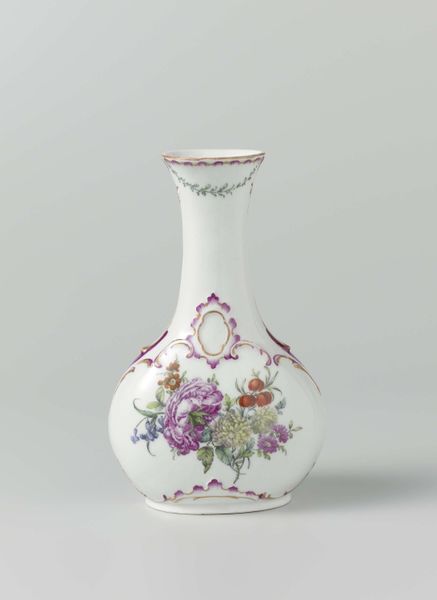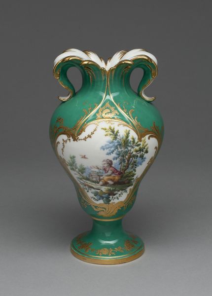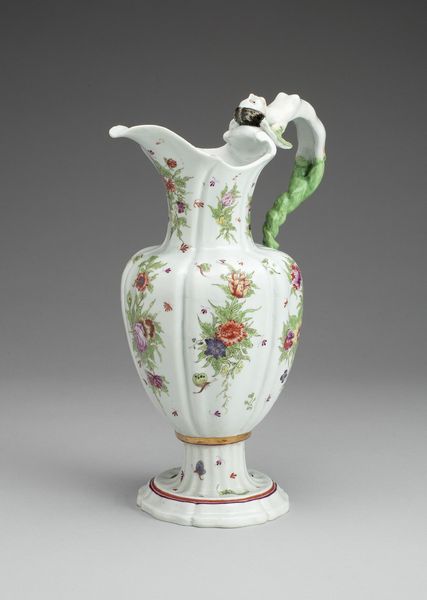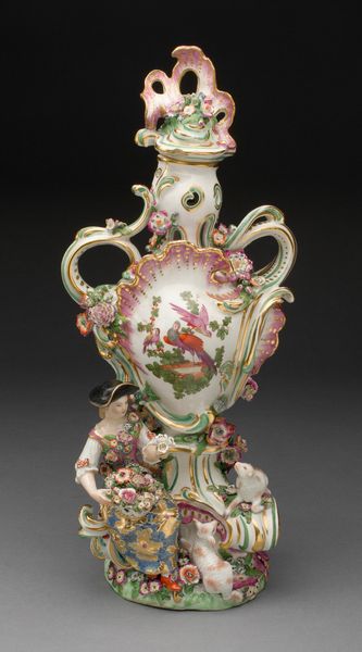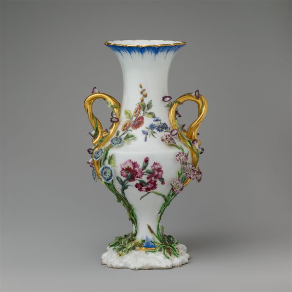Curator: The first word that springs to mind is “delicate." It looks like something out of a fairytale. All swirling forms and impossible lightness. Editor: Precisely! This is a porcelain vase, likely crafted between 1749 and 1752, during the height of the Rococo period. The Art Institute of Chicago proudly holds this example of the celebrated artisan work of Jean-Claude Duplessis. Curator: Rococo! That explains it. It is like confectionary architecture - all sweetness and light. What is that imagery doing, emotionally, to the viewer? Editor: It plays on visual harmony using asymmetry in a powerful way. The vase blooms from a foliage-laden base into gilded handles shaped almost like elegant insect wings and from which sprout dainty porcelain flower appliques. The scattering of painted flower sprigs are a gesture towards both refined decoration but a sense of life barely captured and about to be set free. Curator: So it’s a structured representation of something entirely unstructured— nature in full, glorious abandon. The bright white surface throws those colored blooms into sharp relief. The translucency is incredible; I imagine when the light catches it just so, the vase must glow like a pearl. I am immediately imagining it in one of Fragonard’s paintings. Editor: Indeed. Porcelain in Europe, particularly at this time, was highly prized. Aristocratic display was often meant to convey power and wealth. A piece such as this signals the patron's refined tastes, echoing themes found in paintings of the time - evoking fleeting beauty as a reflection on earthly pleasures and power. It’s about controlled, curated display of a concept more than a representation of something naturally captured, which, to me, is telling of the era itself. Curator: An interesting object lesson there - perhaps more of a power-play disguised by its overt prettiness. Something of a Trojan Horse for the aristocracy... I rather like it! Editor: Perhaps this particular vase acted as a tiny beacon of beauty, or a subtle symbol of the elite at play; but either way, it’s definitely captured a feeling, or an atmosphere, with some élan.