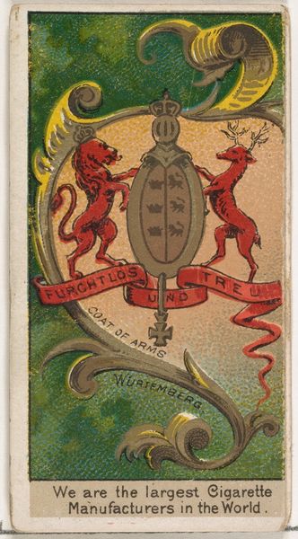 This is a chromolithograph from around 1870-1920, made by W. Duke, Sons & Co. as part of their Rulers, Flags, and Coats of Arms series. The work presents the Coat of Arms of Sweden, dominated by a heraldic shield. The shield is visually stabilized by symmetrical composition and centered placement of the shield. Lions acting as supporters create a balanced design, further emphasized by the use of heraldic colours—primarily red, gold and blue—to structure the visual field. The design functions as a semiotic device, where elements such as the lions signify strength and nobility. The crown suggests authority, and the arrangement of these elements communicates ideas of national identity. The text underscores the role of commercial enterprise within a larger cultural context. Ultimately, the chromolithograph operates on both aesthetic and symbolic levels, reflecting the values of its time and prompting ongoing interpretation of its visual and cultural codes.