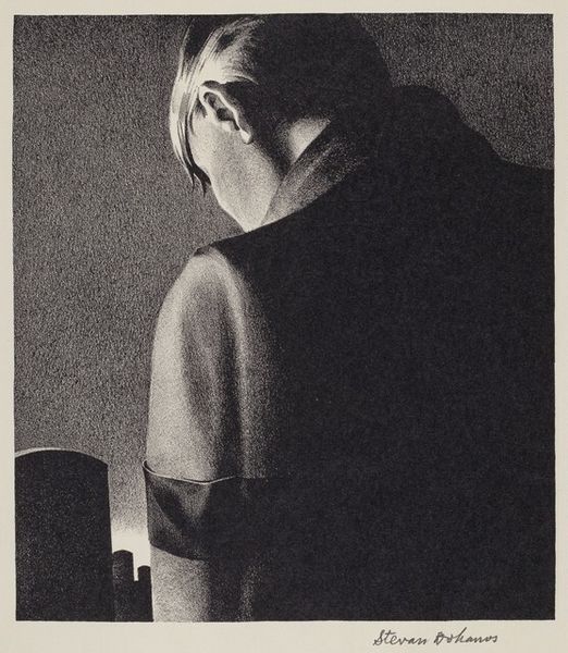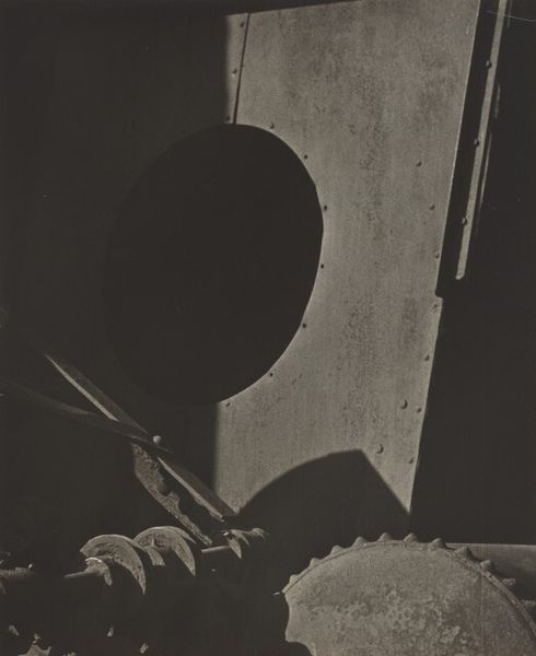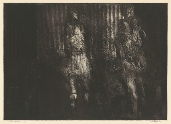 Curator: The atmosphere is so heavy, like a storm gathering just over the horizon. There's a vulnerability suggested by the isolated figure, and yet also a strange strength. Editor: This piece, titled "Moby Dick," is a print, drawing, made with graphite and charcoal on toned paper, dating from around 1974 by the artist David Freed. Curator: The title immediately frames it within a certain socio-political lens, doesn't it? Melville's novel itself a dense exploration of American identity, ambition, and the destructiveness of unchecked obsession. Given the time period, post-Vietnam, it almost screams about lost idealism. Editor: Exactly. But the abstraction pulls away from direct narrative, wouldn't you say? Freed was working in an era grappling with legacies of abstract expressionism and its challenge to the societal role of art. Notice how he plays with light and shadow. It's not merely illustrative but actively constructs the mood, drawing us into Ahab's psyche. Curator: The formal elements enhance the reading of obsession and alienation. The figure is dwarfed. The stark light, almost violently illuminating, becomes another isolating factor. We see it as if cast onto the wall of Plato’s Cave. And what are those geometric shapes below? There seems to be some indication of a boat too, within those angular forms, and maybe more triangular forms, like sails…It suggests the futility of trying to chart something fundamentally unknowable. Editor: Interesting point. You know, during the '70s, institutions were expanding their engagement with artists like Freed, broadening definitions and visibility for contemporary American art and how political narratives were embedded in it. This was not an easily accepted or digested work at the time for audiences or critics. It pushes the boundaries of conventional political commentary into more psychologically resonant territory. Curator: Perhaps what makes "Moby Dick" so effective is how it marries formal abstraction with complex themes related to the socio-cultural milieu of the artist. The individual's fraught relationship with nature, perhaps representative of power structures is still resonant for audiences today. Editor: Precisely. Freed manages to engage history while probing the depths of the human condition and still raising timely questions about contemporary society.