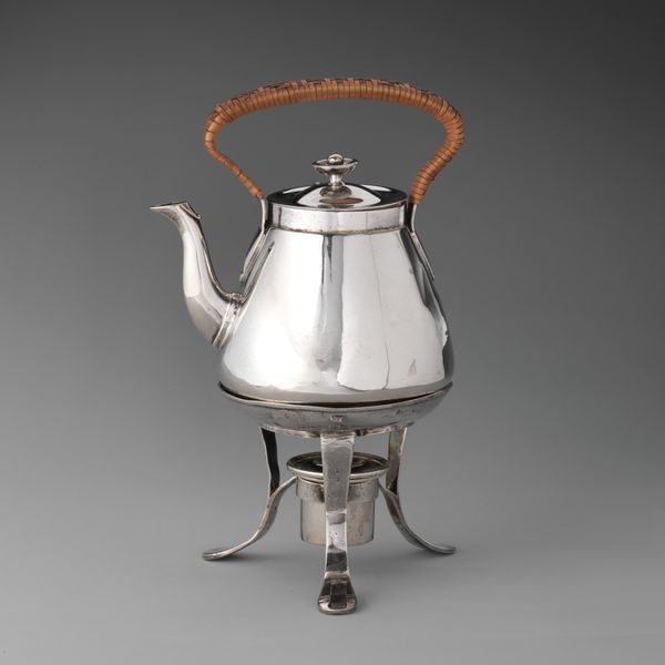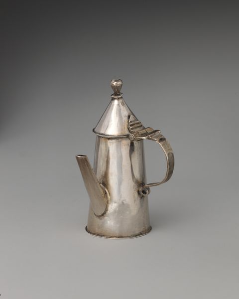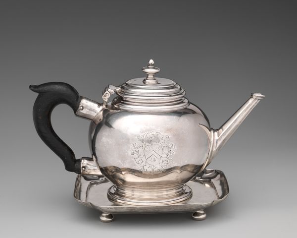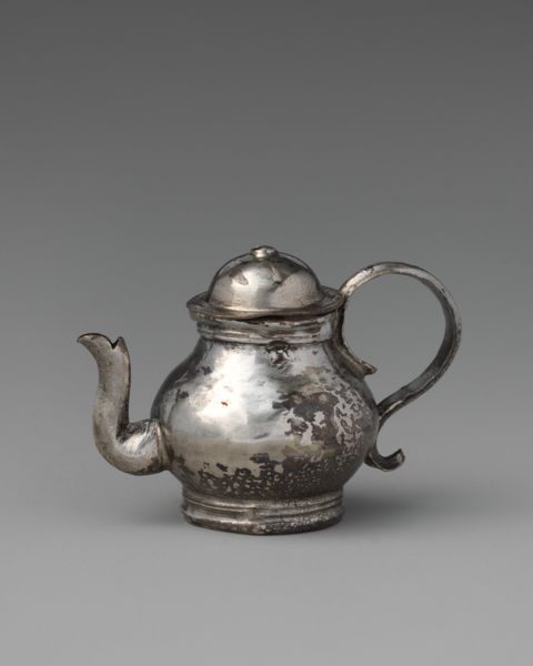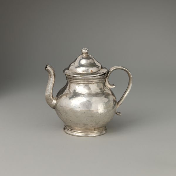 This pewter teapot, crafted by an anonymous hand, invites us to consider the enduring symbolism embedded within everyday objects. Notice the fleur-de-lis crowning the lid, a motif that once signified French royalty and nobility. This symbol's journey through time is quite remarkable. Originally associated with divine right and power, the fleur-de-lis echoes in various forms across different cultures. We see it subtly transformed in medieval heraldry, adorning family crests and emblems, and even in religious iconography. Here, on a humble teapot, it speaks of aspiration, perhaps a subtle nod to elegance and refinement. Consider how such symbols persist, evolving yet retaining a trace of their original aura, engaging our subconscious with echoes of history and cultural memory. The presence of the fleur-de-lis, even in this understated form, evokes a sense of continuity, of the past subtly influencing our present perceptions.