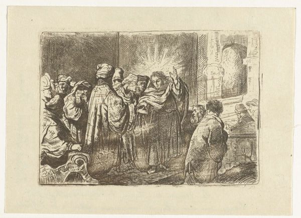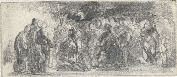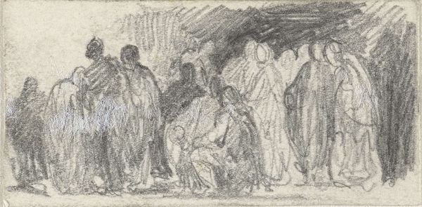 Editor: We're looking at "Studie van een groep mensen bij een boot," a pencil drawing by Johannes Jacobus Bertelman, made sometime between 1831 and 1899. It's a lively sketch, all grays and quick strokes. The boat is suggested in the background, but the focus is on this gathering of people. What do you make of it? Curator: Well, seeing a piece like this from Bertelman, who lived through such a transformative period in Dutch history, it’s fascinating to consider its possible context. Given the social changes during his lifetime, from monarchies to nascent democracies, does this scene strike you as depicting any particular social class or aspiration? Is it celebrating a new, emergent middle class engaging in leisure, or perhaps documenting a working-class community? Editor: It's hard to tell for sure with the lack of detail, but their posture and clothing make me think of everyday folk. It doesn't feel celebratory exactly, more like a fleeting snapshot. Curator: Precisely. And think about where this drawing might have been displayed. Not likely a grand salon, but perhaps a print shop or circulating within artist circles. This kind of intimate portrayal of the populace aligns with a growing interest in Realism, moving away from idealized depictions. Do you think this drawing challenges or reinforces the prevailing artistic standards of its time? Editor: It seems like a challenge, honestly. It’s not romanticized or posed; it feels genuine. A look into everyday life. Curator: Yes, and that very choice is a statement in itself. The ‘everyday’ became worthy of artistic attention, reflecting broader shifts in societal values and artistic practices. By immortalizing an ordinary moment, Bertelman subtly elevated the significance of ordinary people and their stories. Editor: I see it now. This quick sketch really says a lot about the changing times and where art was headed. It is more than a drawing; it’s a social document. Curator: Exactly. Looking closely has revealed more than we might have initially thought. A good reminder to consider art's place in the broader culture!