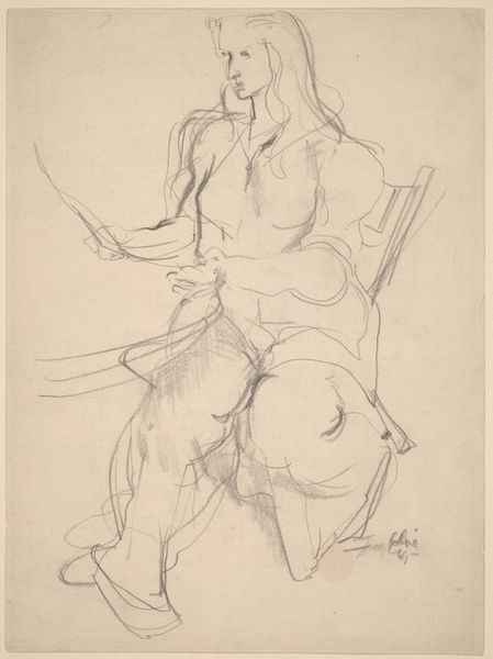 Alphonse Mucha made this drawing of a female nude using graphite on paper. The traditional art materials allow for the creation of delicate lines that capture the contours and volume of the human form. The artist’s skilled handling of the graphite is evident in the subtle gradations of tone and texture, giving the figure a sense of depth and realism. Notice how the artist uses hatching and cross-hatching to build up shadow and create a sense of three-dimensionality. The figure's pose and expression, as well as the handling of light and shadow, create a contemplative mood. The sketchlike quality of the drawing shows the artist's working process, and the way he built up the image through careful observation and mark-making. By focusing on the artist's process and the material qualities of the drawing, we gain a deeper appreciation for the work as a whole. This emphasis challenges traditional notions of fine art by highlighting the importance of craft and skill in creating a powerful and evocative image.