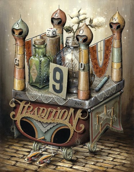 Curator: Here we have "Tiny Collector" by Jason Limon, created in 2016. It's a mixed-media work, primarily oil paint, that flirts with pop-surrealism and realism. Editor: First glance? It's a whimsical, melancholy little cabinet of curiosities. There's something sweetly haunting about this object – like childhood memories locked inside a rusty machine. Curator: Limon's style often uses these aged or weathered textures, hinting at a past that's been both cherished and somewhat forgotten. This plays into broader art-historical themes of nostalgia, particularly within consumer culture. The objects depicted invite speculation. Editor: The arrangement's fantastic, isn't it? That half-visible crown-and-dice combo has got a certain narrative appeal! And who decided to put the football helmet so near to that little toy dog? I'm picking up on ideas of value and memory, how we assign worth to the things that hold echoes of our lives. Are these items precious or merely strange? Are they being sorted, categorised? Curator: Right! It makes me consider what stories are being told when ordinary, found objects are elevated to almost museum-like status, even as they are contained in a ‘toy’. It touches upon the tension between objecthood and art objecthood. It really questions the idea of collections themselves and that human impulse. Editor: There's also a clever wink at automatons, at cause and effect. The coin slot invites action; it makes me want to crank that handle! I’d wager something bizarre and lovely pops into view. Almost as if a wish fulfillment machine for your inner child. Curator: Limon positions us to consider how art engages with contemporary desires and anxieties around collecting and consumerism. It brings those desires into the artistic space to explore, almost as artifacts. Editor: Absolutely. So it's a rumination on nostalgia, rendered with beautiful craft and an uncanny playfulness. The layers create a whole other level of fascination. Curator: I agree. It provides viewers with space to meditate on the intersection between childhood, memory, and our relationships with the things we accumulate over a lifetime.