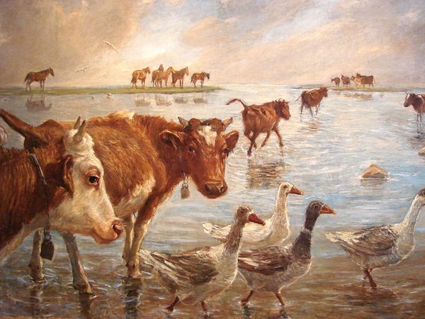 Theodor Philipsen captured this pastoral scene with oil on canvas, revealing a world where nature and domesticity intertwine. Central to the composition are the animals, each laden with symbolic weight. Cows, those gentle ruminants, have long been symbols of nourishment and plenty, harkening back to ancient fertility cults. They remind us of the primal connection between humans and the land, echoing through Minoan frescoes and Egyptian hieroglyphs. The geese, with their watchful eyes, may evoke the Roman legend of the geese of the Capitoline, symbols of vigilance and guardianship. This motif is deeply ingrained in our collective consciousness, representing both protection and an awareness of unseen threats. Even horses can be interpreted through the lens of history, embodying freedom, power, and vitality. The clustering of these animals around a water source carries deep emotional weight, suggesting a yearning for sustenance and connection, tapping into our most primitive and enduring needs.