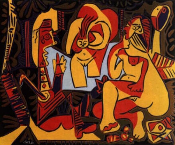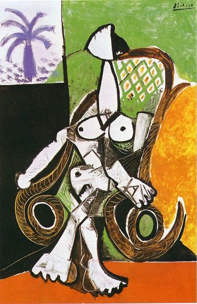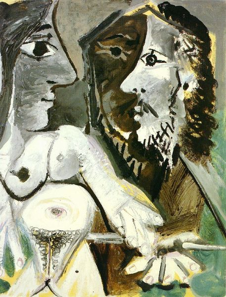 Editor: Here we have Picasso’s "Standing female nude and man with pipe" from 1968, painted with acrylic. The bold lines and clashing colors create a somewhat uneasy atmosphere, like a slightly off-kilter dream. The composition, especially the fractured forms, leaves me a bit bewildered. What do you see in this piece? Curator: Oh, my dear, this is late Picasso – raw, unburdened by expectation. Forget perfection! Here, he’s practically thumbing his nose at it. Notice how the woman's form is both present and distorted? It's like he's remembering a body, rather than strictly depicting it. And the man with the pipe? He's all sharp angles and geometric shapes, a kind of… cardboard cutout king. Does that contrast strike you at all? Editor: It does now that you mention it. He seems almost…constructed next to her more fluid form. Curator: Exactly! Picasso is exploring the tension between masculine and feminine, real and imagined, concrete and abstract. There is also a deep look into his personal life at the time; he’s wrestling with aging, desire, mortality... the works. It’s as if he's saying, "This is what love, life, and art look like to me now – a glorious, imperfect mess!" What do you think it might represent to him to include these imperfect elements? Editor: So, it’s less about flawless execution and more about raw emotional honesty? It definitely changes how I see the piece. I appreciate its vulnerability now. Curator: Absolutely. Late Picasso is not always pretty, but it's always deeply, profoundly *Picasso*. Editor: This really challenged my initial perspective and has given me so much to think about in terms of legacy, expression, and…messiness.