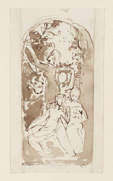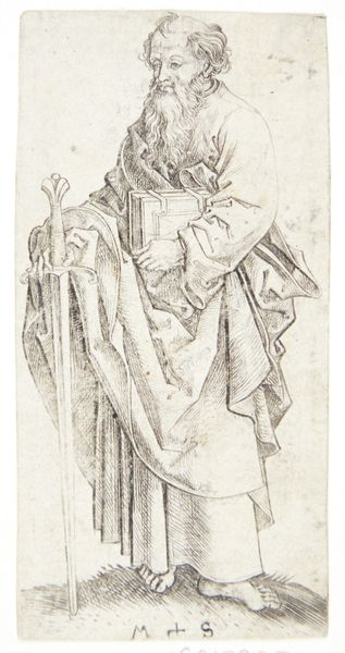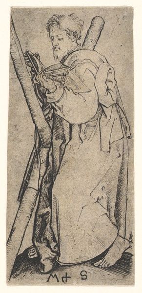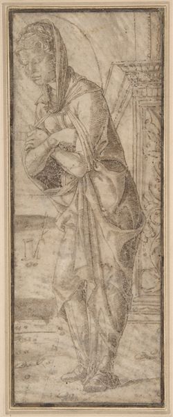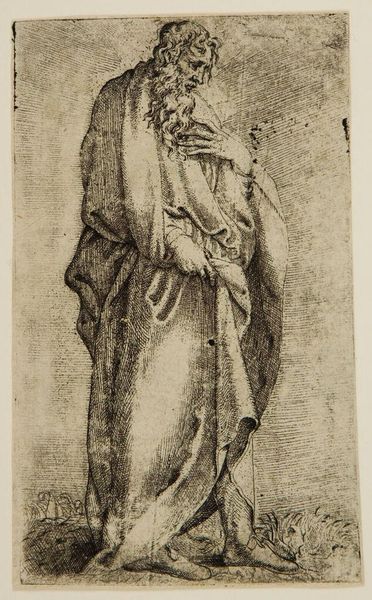 Editor: So, here we have Matthys Pool’s “Standing Youth Drinking from a Cup,” made sometime between 1685 and 1730. It's an etching, so it has these crisp lines that give the figure a somewhat stark and simple feel. What stands out to you when you look at it? Curator: It's the method of production itself that grabs my attention. Think about the etching process: the acid biting into the metal plate, the labor involved in creating multiples, each one slightly different. How does this repetitive, almost industrial process, inform our understanding of what the artist intended to convey in this baroque period piece? Is it about accessibility, the devaluing, perhaps, of the unique artwork, or merely distribution? Editor: That’s a great point, I was so caught up in the figure that I didn’t consider the socio-economic factors involved in making a print. Curator: Consider also how the act of drinking, something mundane and common, is rendered here. What cup is the youth drinking from? What resources or trade networks made this act possible? How did class dynamics determine what vessels or beverages one could consume? By questioning the raw materials involved in every act portrayed we start to dismantle hierarchical notions separating fine art from the material realities of daily life. Editor: I guess it’s about thinking past the romantic image and looking at what was going on materially, too, both in its creation, in distributing the prints, and even with what the subject is holding! The means of production have shifted our understanding of both content and reception. Curator: Precisely! It highlights the inherent connection between artistic expression, production practices, and cultural contexts that underpin and propel artwork.