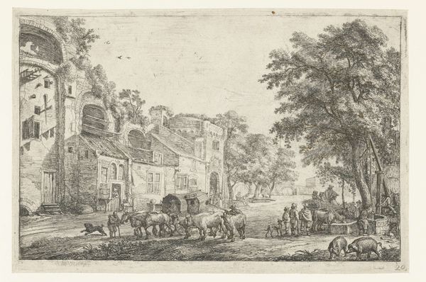 Editor: This is "Hanengevecht" by Matthijs Schoevaerdts, created between 1682 and 1702, an etching depicting a bustling street scene. There’s almost too much going on—people are haggling, climbing ladders, and right there in the front, well, the chickens are at each other! How do you unpack something so crammed with everyday life? Curator: It's fascinating to consider the historical context of these genre scenes. "Hanengevecht," meaning "cockfight," isn’t just about the spectacle itself; it’s a window into the social and economic life of the period. These gatherings served as spaces for trade, socializing, and displaying status. What do you think this print tells us about the artist's perspective or intentions? Editor: I suppose it's a snapshot, capturing all social classes mixed together…maybe with a critical eye? The people look kind of… exaggerated? Curator: Exactly! Consider the exaggerated gestures and expressions. Do you think Schoevaerdts is simply documenting reality, or perhaps commenting on the chaos and maybe even the underlying inequalities present in these public spaces? Was it considered acceptable entertainment for the time? Editor: That’s true! Cockfighting as entertainment makes me uncomfortable and wasn’t legal for all classes even at that time. The etching does invite the viewer to consider power dynamics. It’s both documentation and critique, I think. Curator: I agree. The choice to depict this scene, rather than idealized landscapes or portraits favored by the elite, positions Schoevaerdts within a tradition of artists engaging with the everyday lives of ordinary people. Understanding art in its historical and social contexts helps us move beyond simple aesthetics and into complex social critiques. Editor: It’s incredible to think how much a simple print of a street scene can tell us! Looking at the social role that artworks have gives me much more appreciation than looking at beauty or visual pleasure.